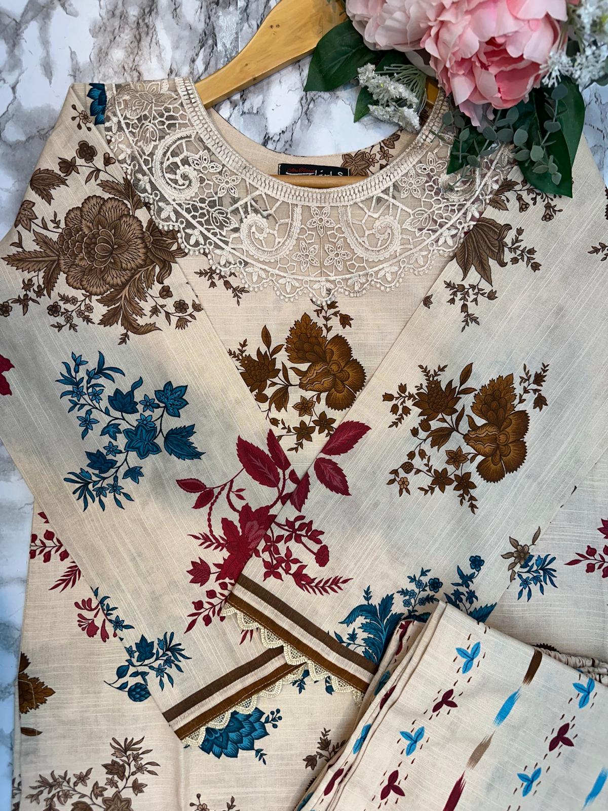 Elevate your wardrobe with this sophisticated three-piece khaddar suit, expertly crafted with intricate embroidered patchwork detailing. The ensemble features a beautifully tailored kurta adorned with precision embroidery, complemented by coordinating trousers and a luxurious shawl. Khaddar's renowned durability and natural breathability make it ideal for year-round wear, whilst the designer patchwork elevates this piece beyond everyday wear. Perfect for festive occasions, formal gatherings, or refined casual settings. Each element is thoughtfully constructed to deliver both comfort and timeless elegance.