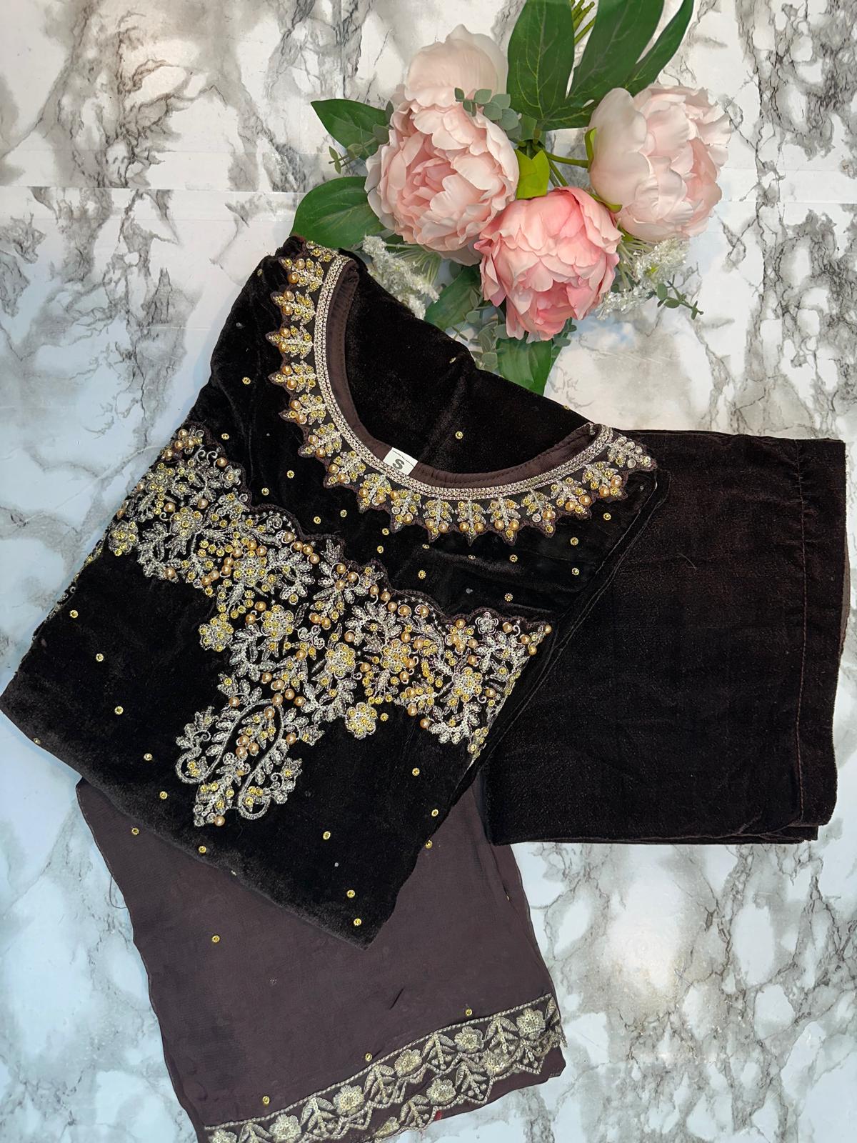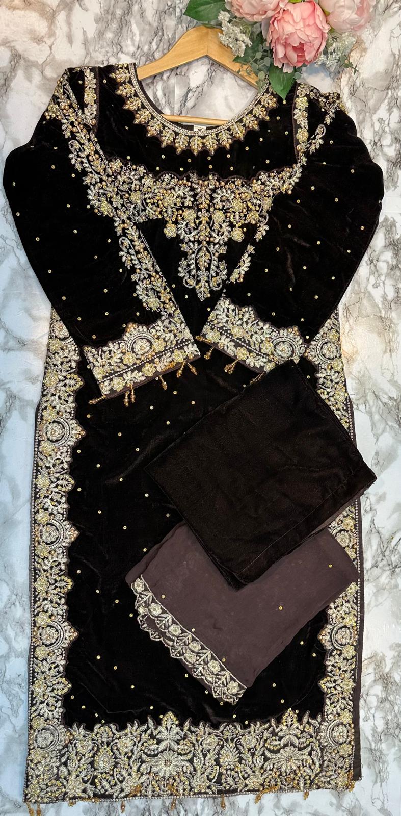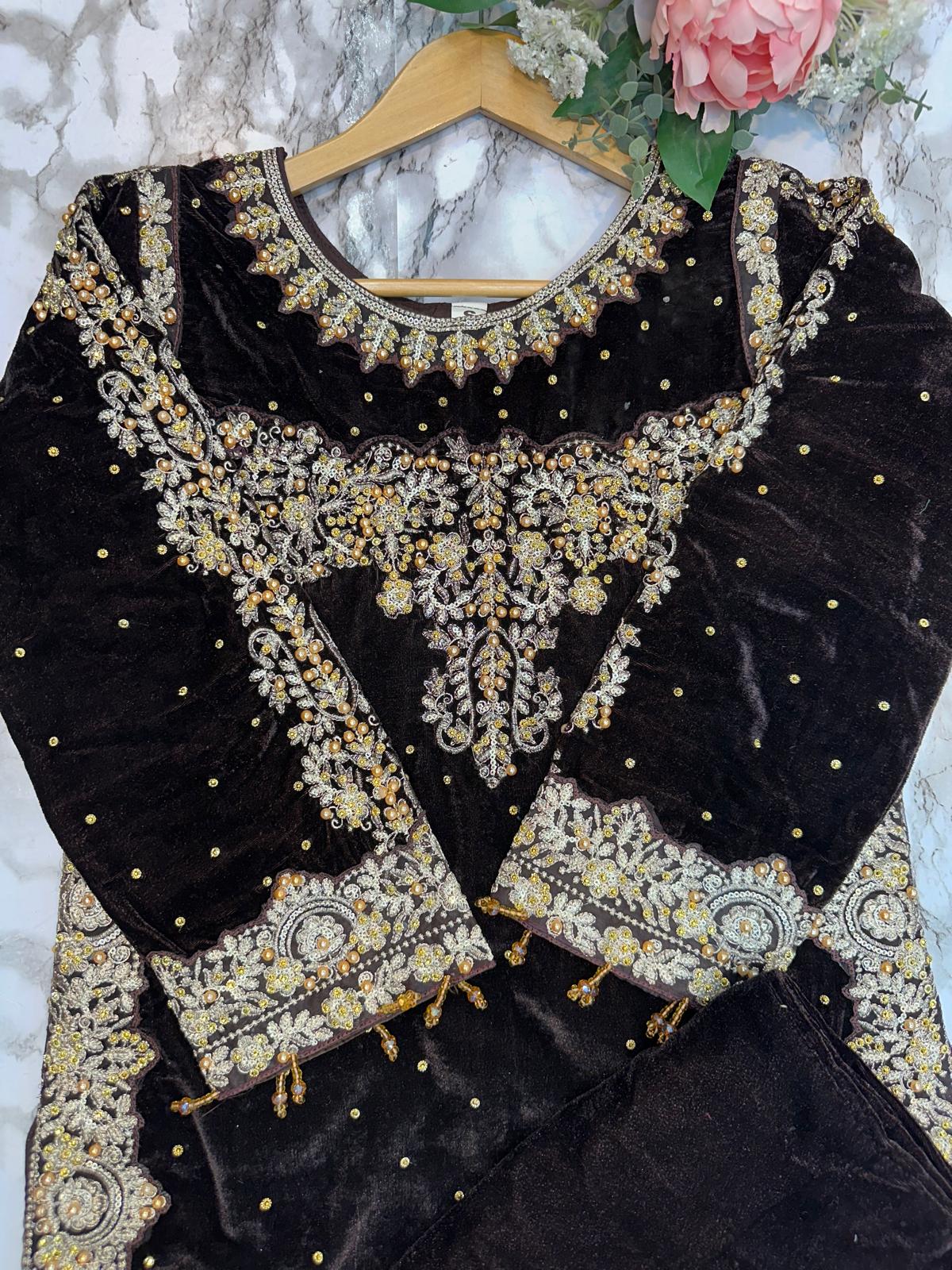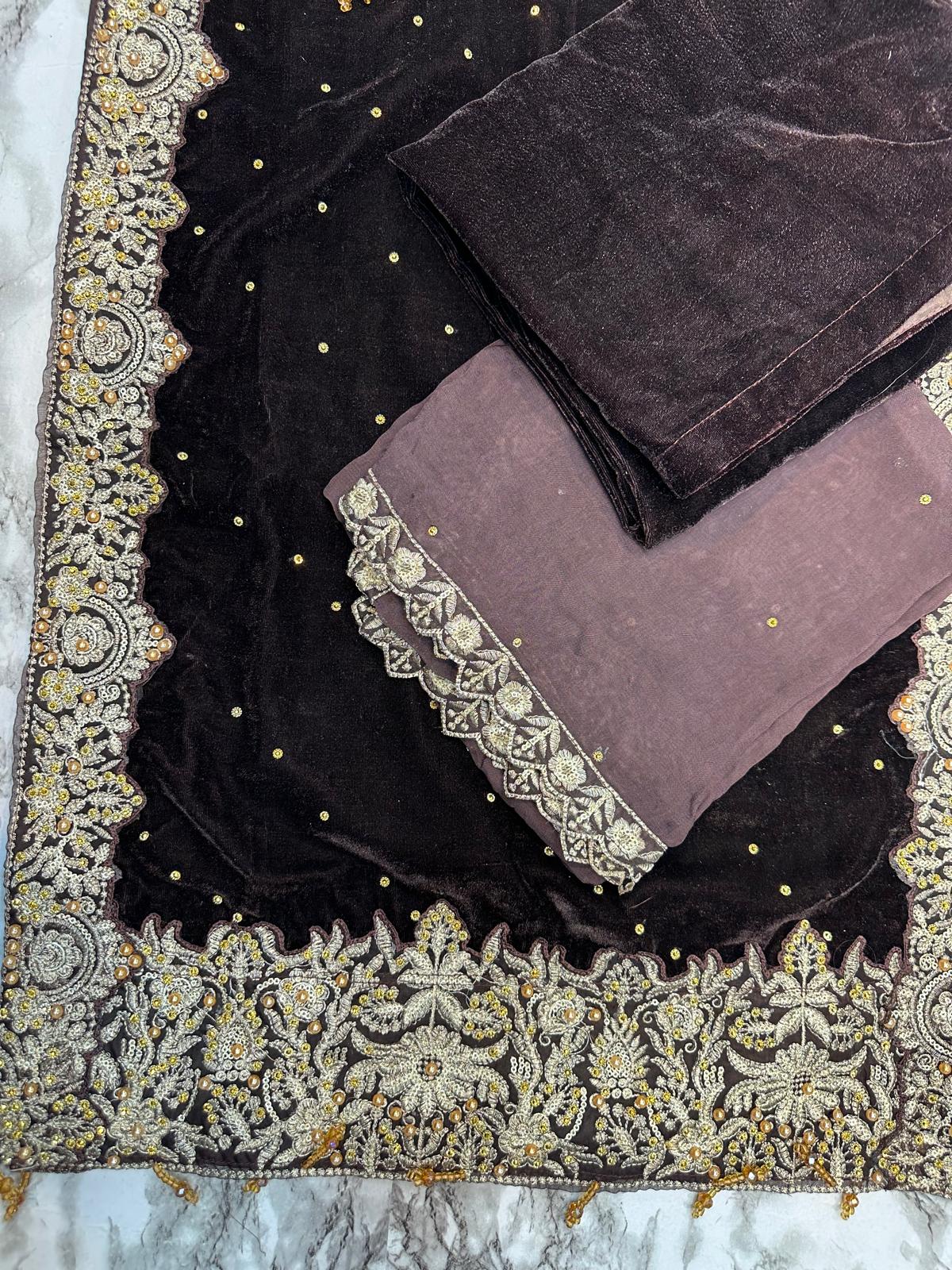 DARK BROWN 3 PC LUXURY | VALVET  PAKISTANI LADIES WINTER | PLAZZO SUIT