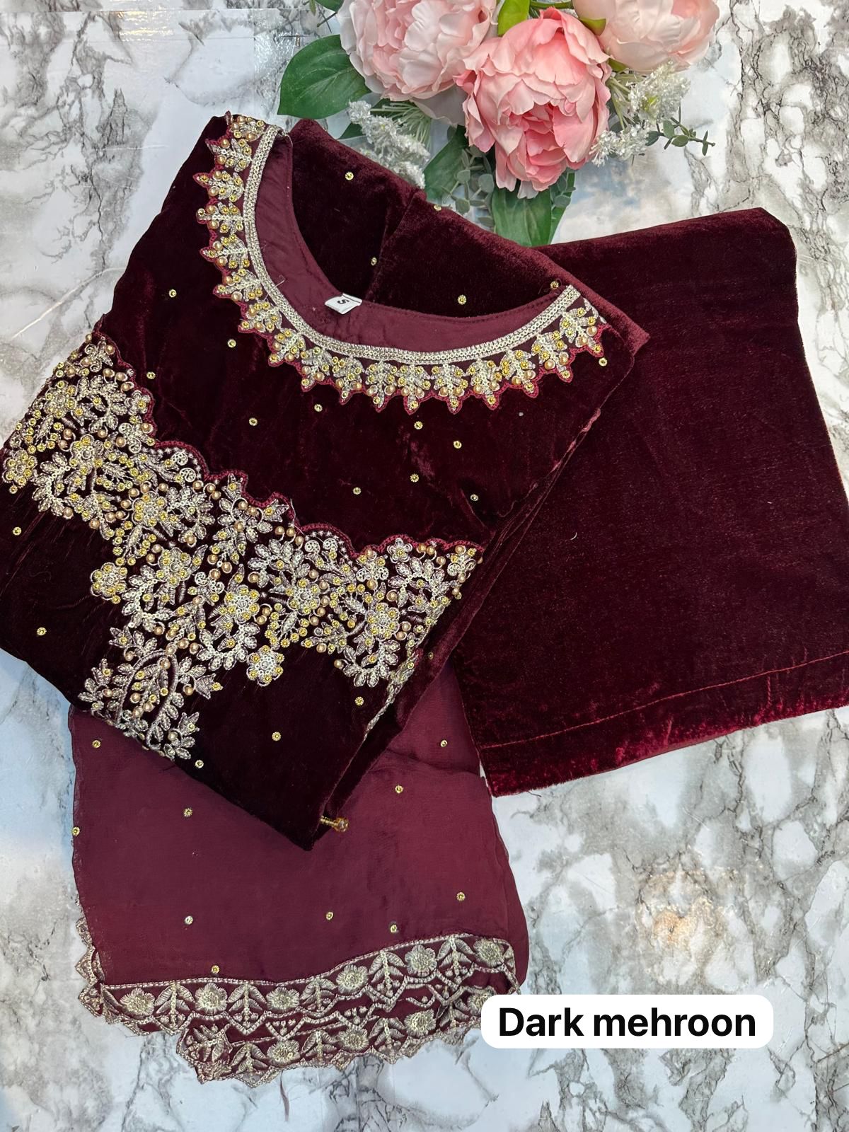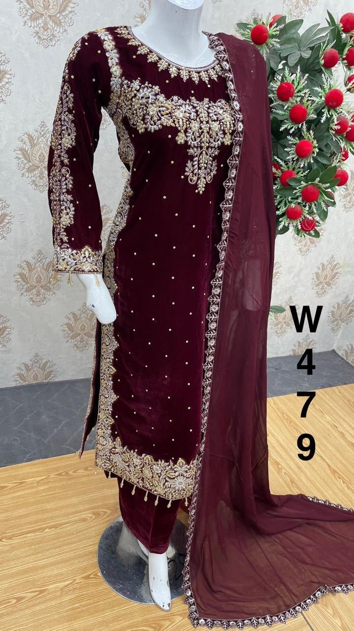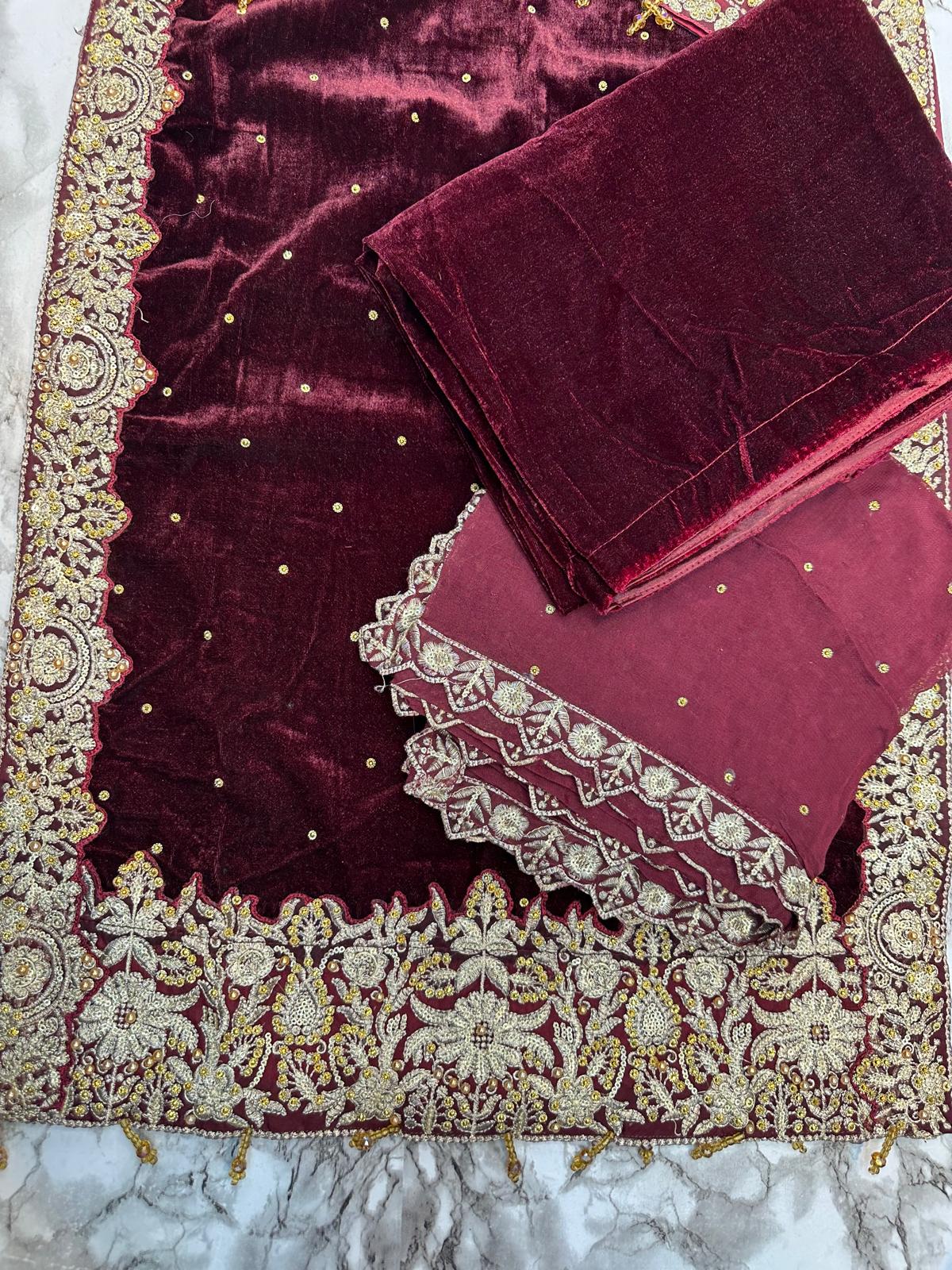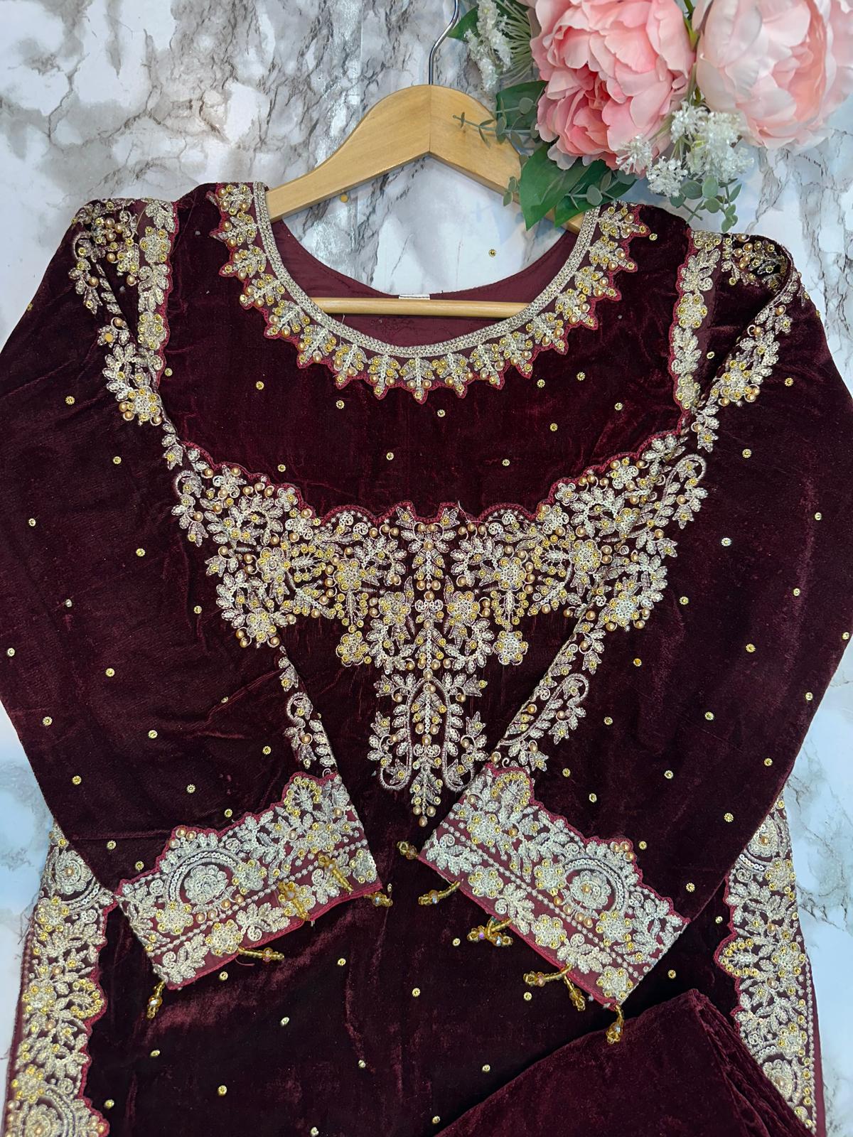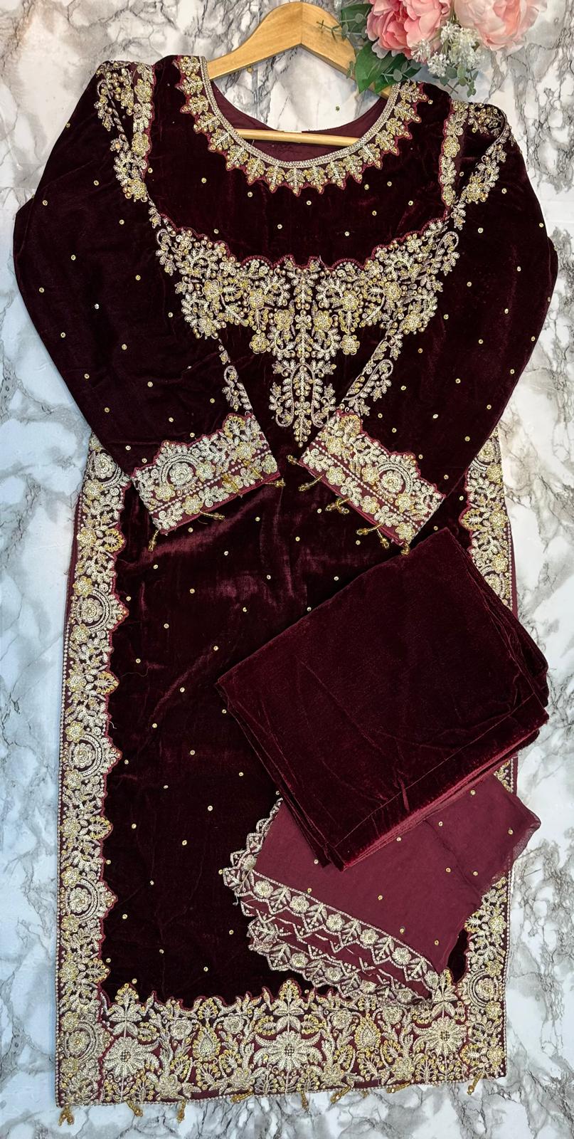 DARK MAROON 3 PC LUXURY | VALVET  PAKISTANI LADIES WINTER | PLAZZO SUIT