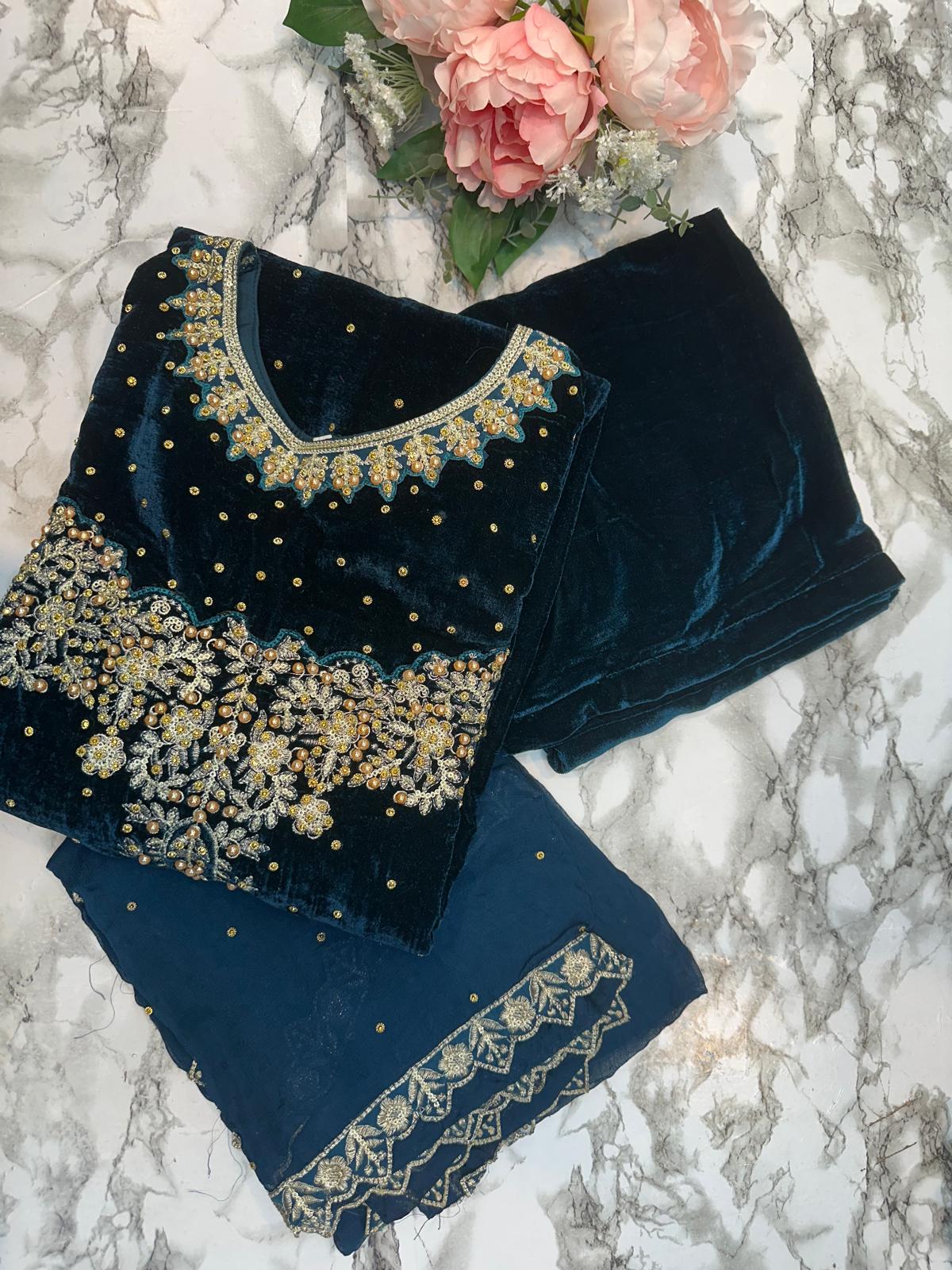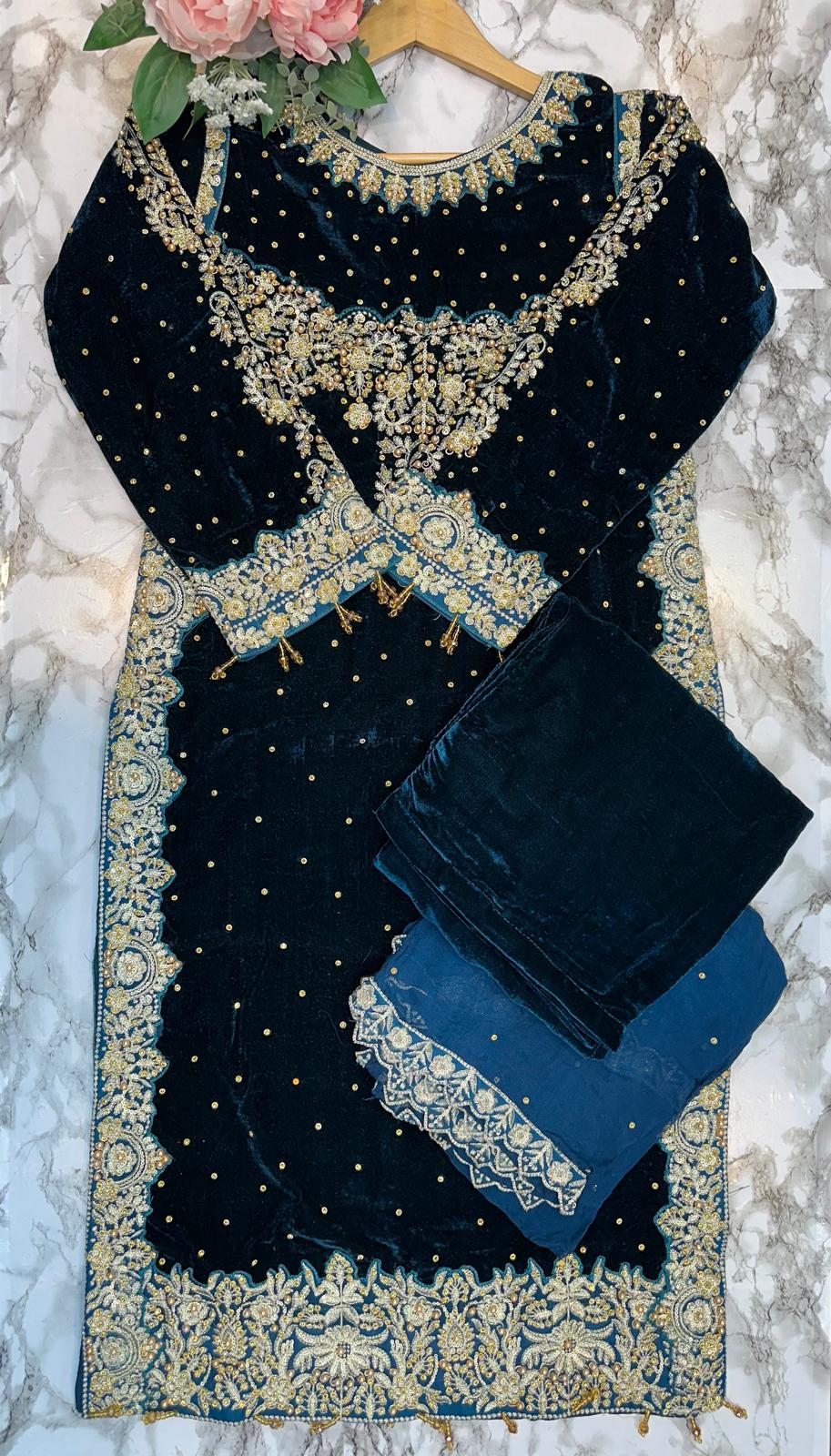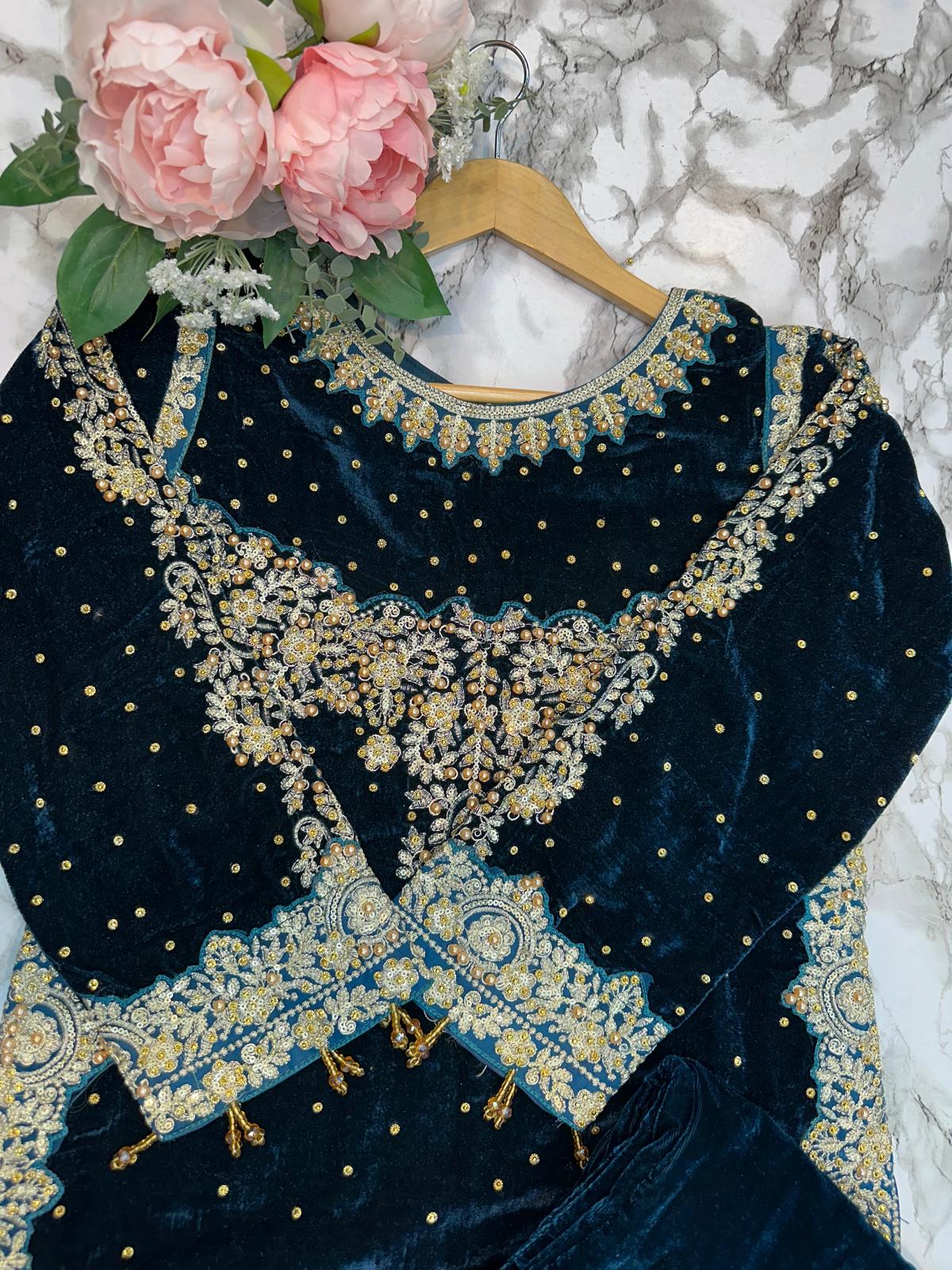 TEAL BLUE 3 PC LUXURY | VALVET PAKISTANI LADIES WINTER | PLAZZO SUIT