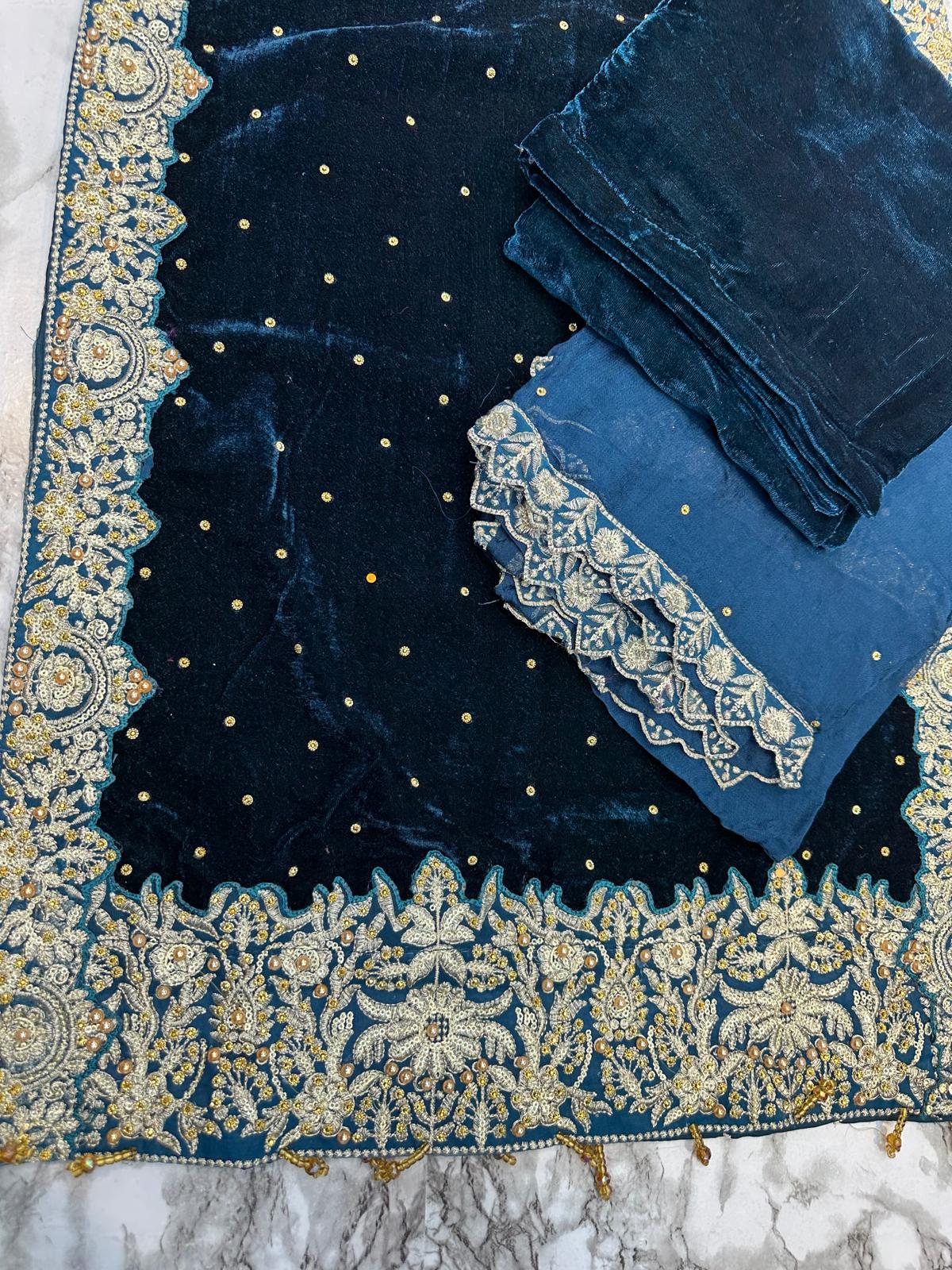 TEAL BLUE 3 PC LUXURY | VALVET  PAKISTANI LADIES WINTER | PLAZZO SUIT