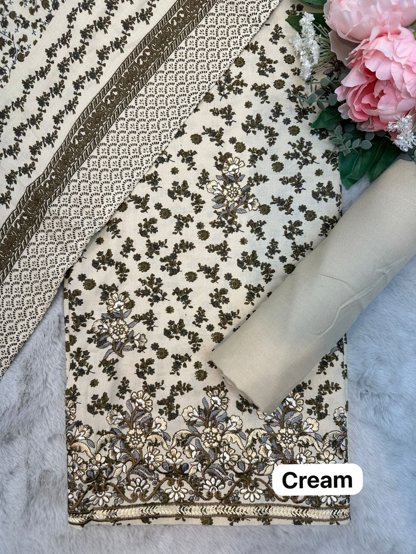D-1171 Cream Winter Embroidered Unstitched Alpine Suit