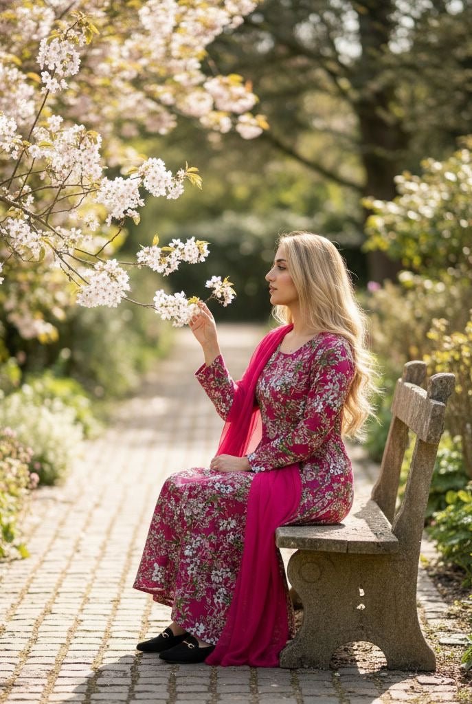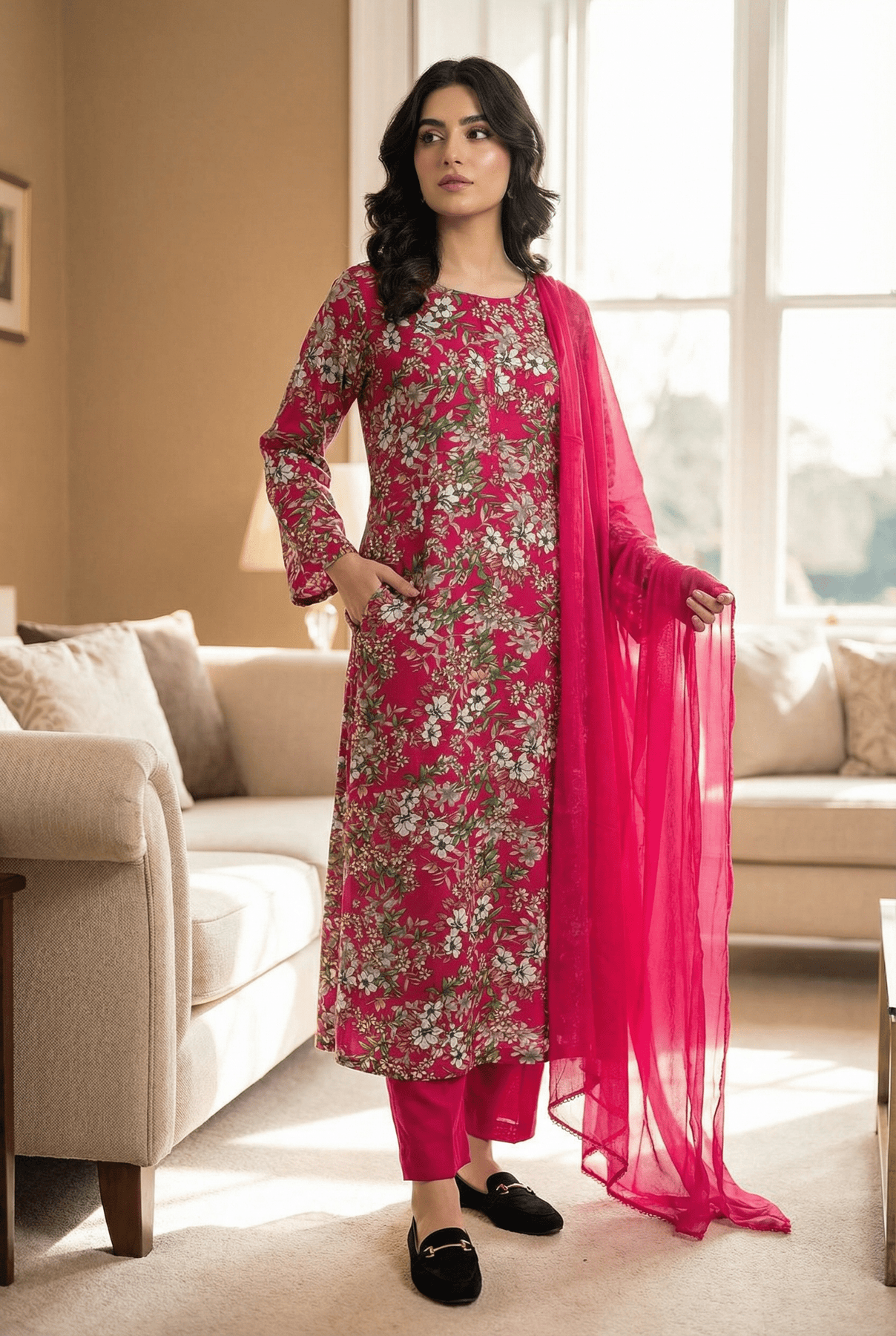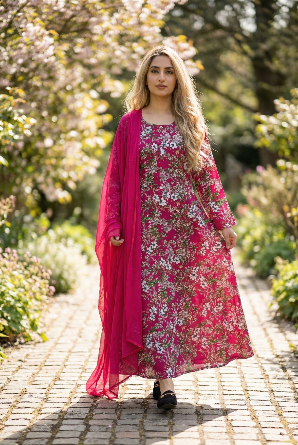 Elevate your wardrobe with this exquisite floral printed long dress suit, crafted from premium stone linen for a refined, breathable finish. The intricate floral design brings timeless elegance to any occasion, whilst the flowing silhouette ensures effortless grace and comfort. Complemented by a delicate chiffon dupatta, this ensemble offers versatility for both formal gatherings and sophisticated everyday wear. The natural linen fabric provides durability and a luxurious drape, making this a worthy investment piece that transcends seasonal trends. Perfect for those who appreciate quality craftsmanship and understated luxury.