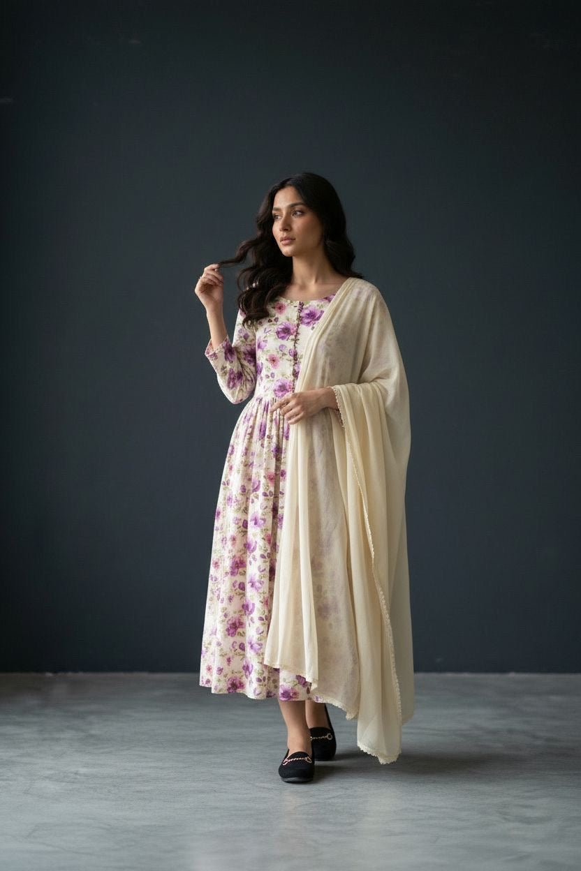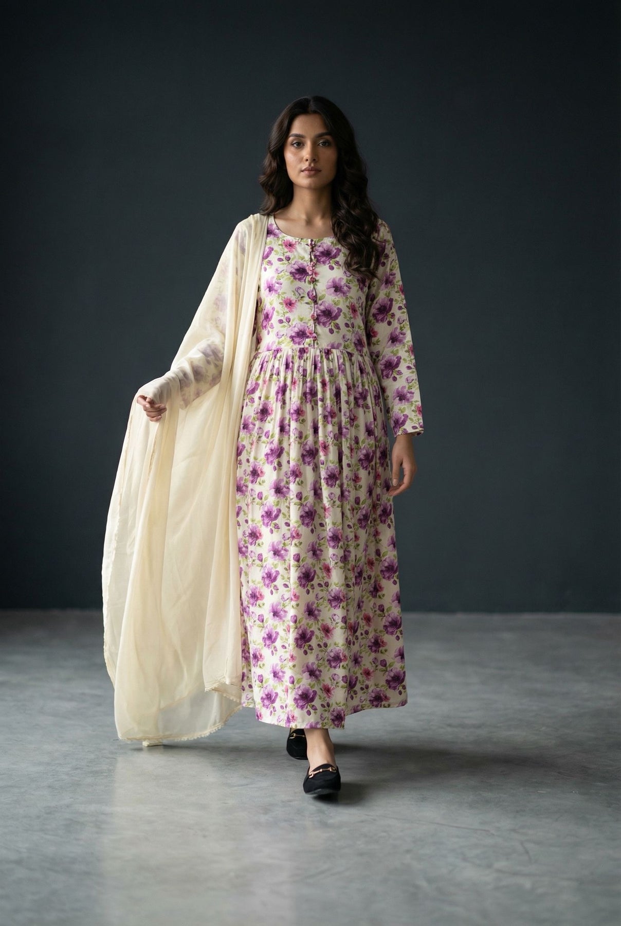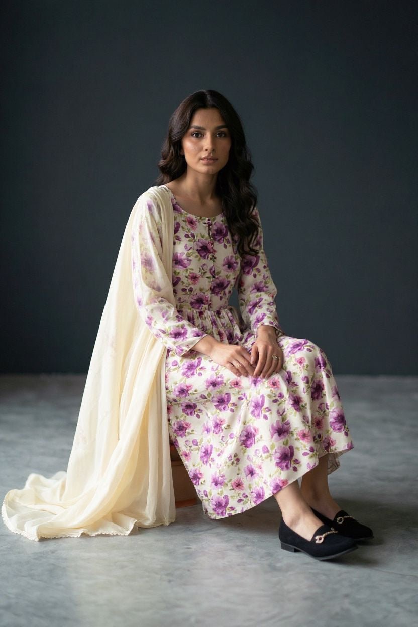 FLORAL PRINTED | STONE LINEN READY TO WEAR LONG DRESS| SUIT WITH CHIFFON DUPTTA