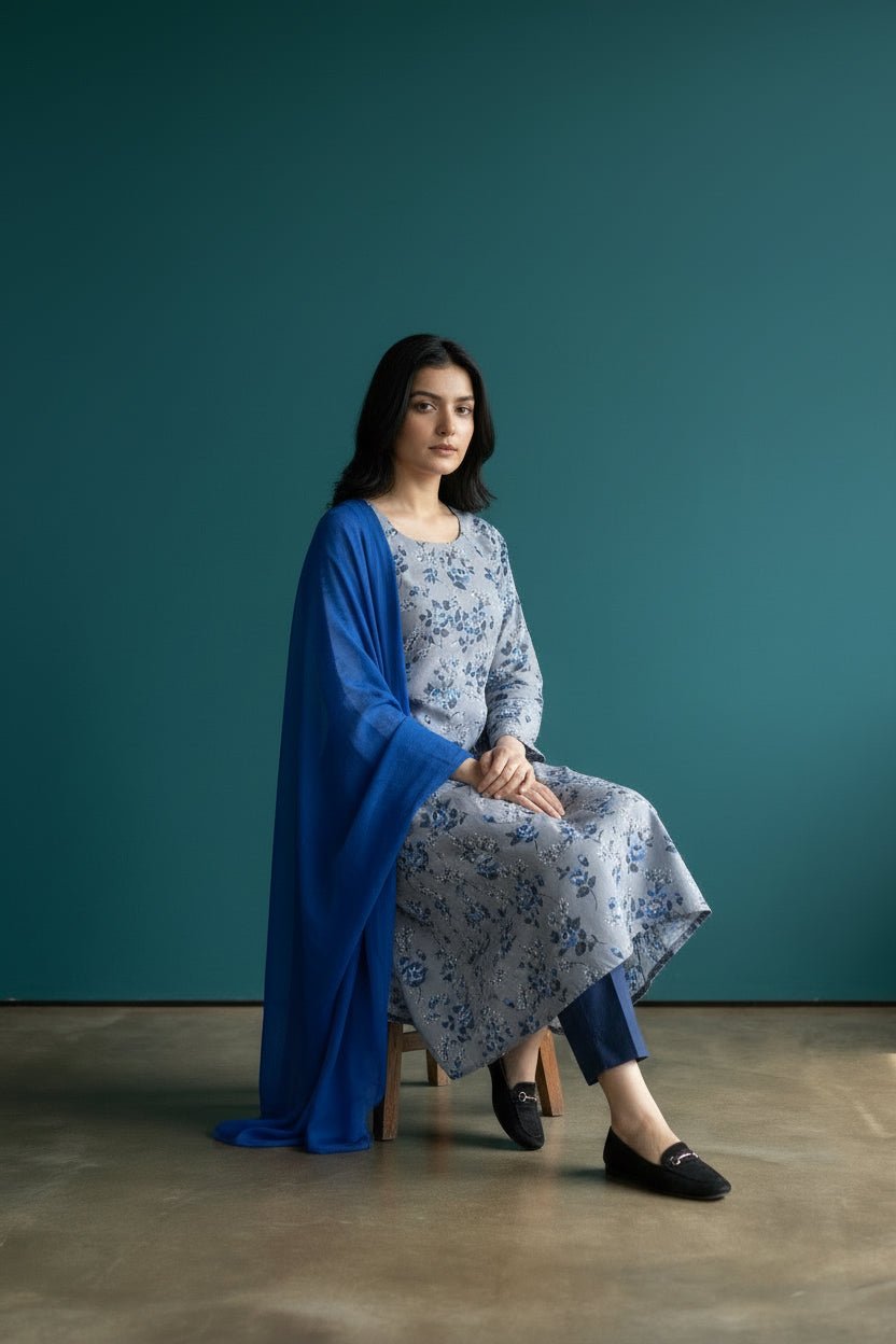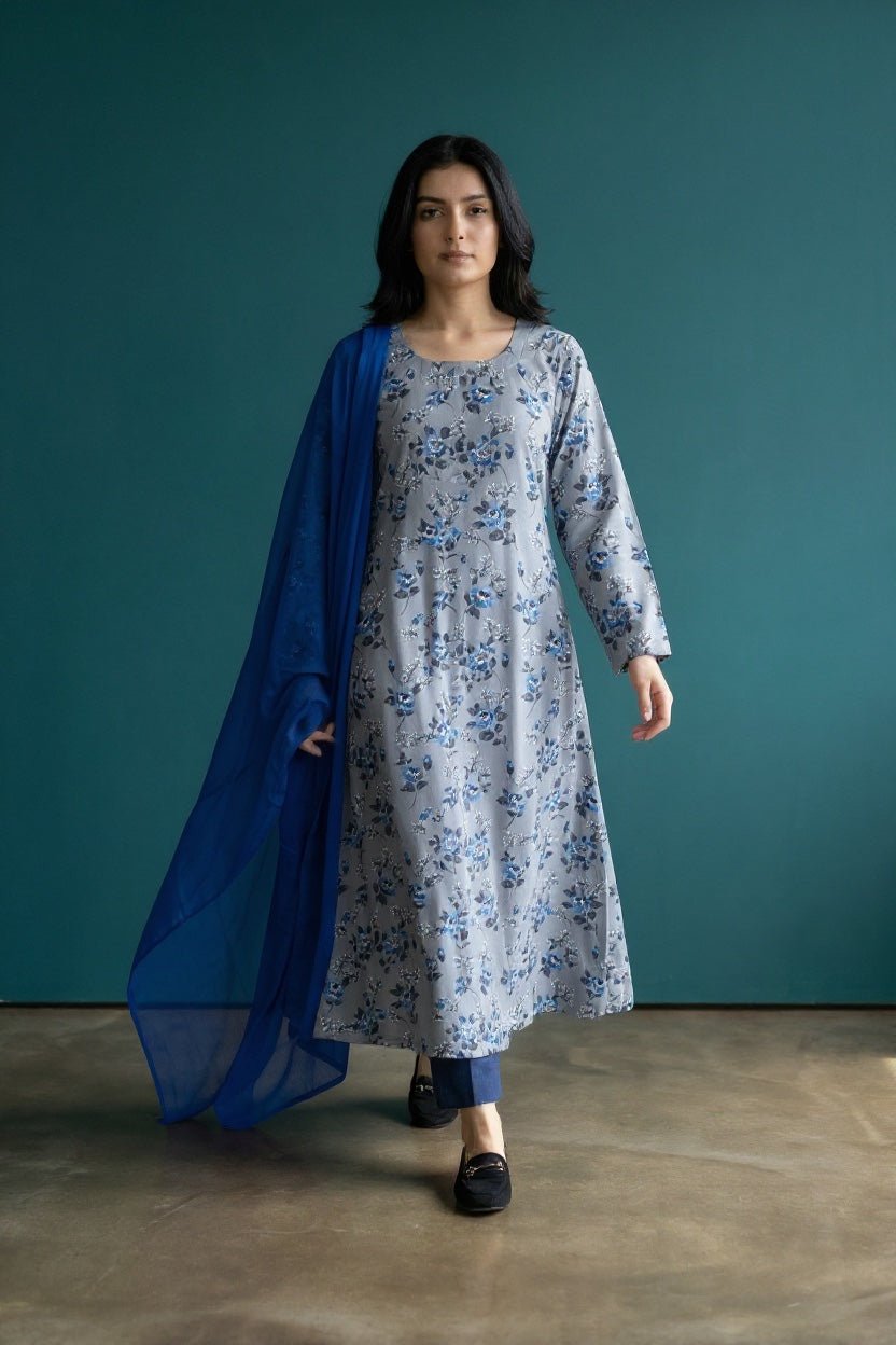 Elevate your wardrobe with this exquisite floral printed long dress suit, crafted from premium stone linen for a refined, breathable finish. The intricate floral design brings timeless elegance to any occasion, whilst the flowing silhouette ensures effortless grace and comfort. Complemented by a delicate chiffon dupatta, this ensemble offers versatility for both formal gatherings and sophisticated everyday wear. The natural linen fabric provides durability and a luxurious drape, making this a worthy investment piece that transcends seasonal trends. Perfect for those who appreciate quality craftsmanship and understated luxury.