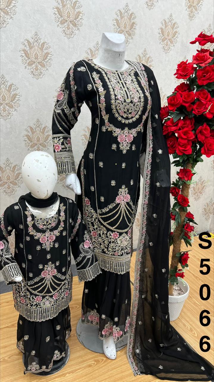 Black - Embroidered Gharara Chiffon Mother & Daughter Ready to Wear Collection - Perfect for Family