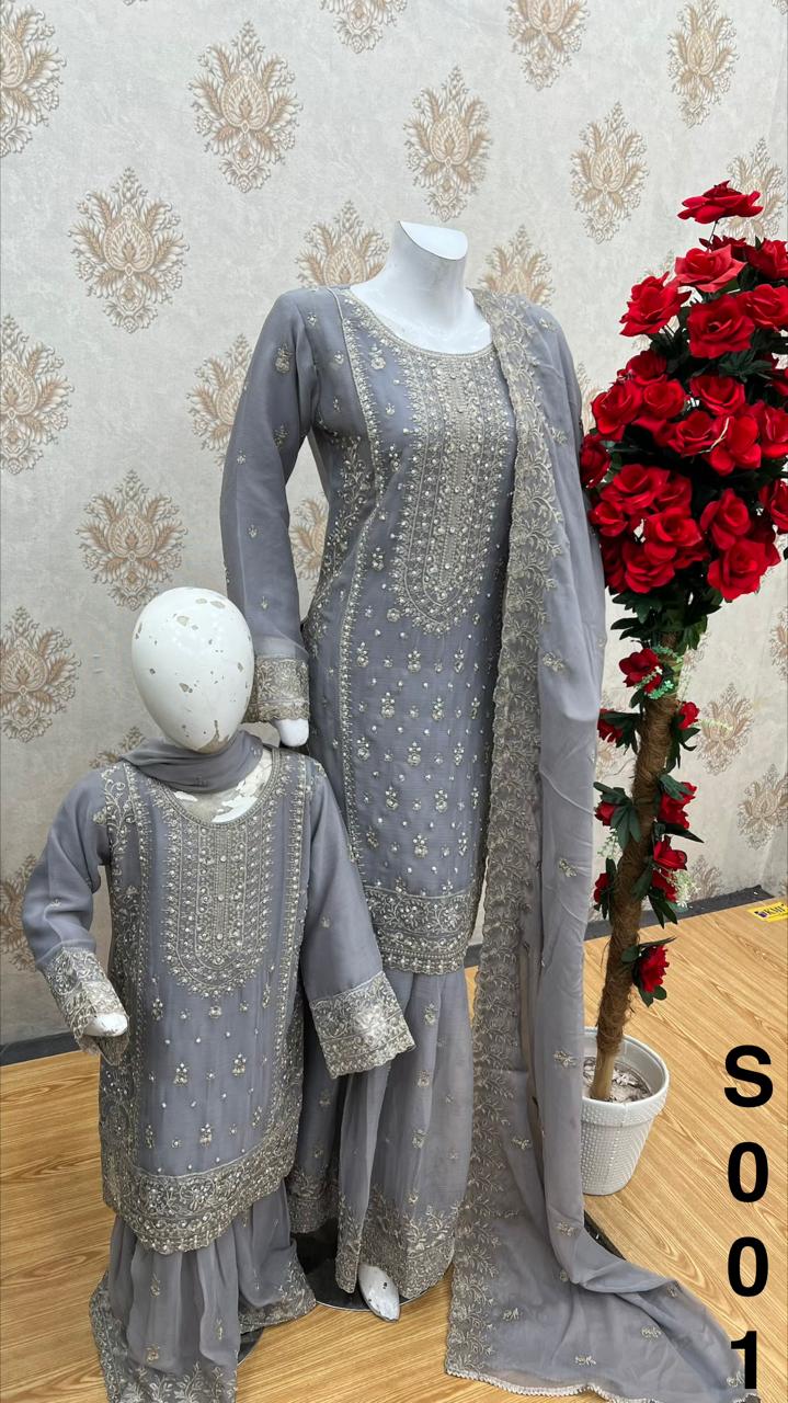 Introducing the Embroidered Gharara Chiffon Mother & Daughter Ready to Wear Collection, the perfect addition to any family's wardrobe. This collection is designed to provide a matching and coordinated look for both mother and daughter, making it easier to dress up for special occasions.
