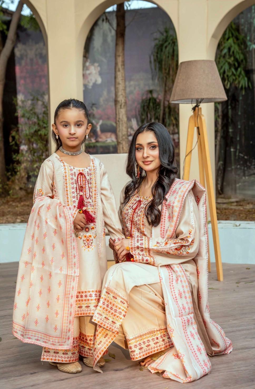Celebrate the bond between mother and daughter with our exquisite Embroidered Plazoo Viscose collection. Crafted from premium viscose fabric, each piece features intricate embroidery detailing that showcases traditional artistry. The coordinated designs allow you and your daughter to share a cohesive, elegant look for special occasions, family gatherings, or everyday wear. Viscose's natural breathability and soft drape ensure comfort throughout the day, while the refined embroidery elevates any occasion. This ready-to-wear collection combines timeless style with practical quality, making it an ideal choice for families seeking coordinated sophistication.