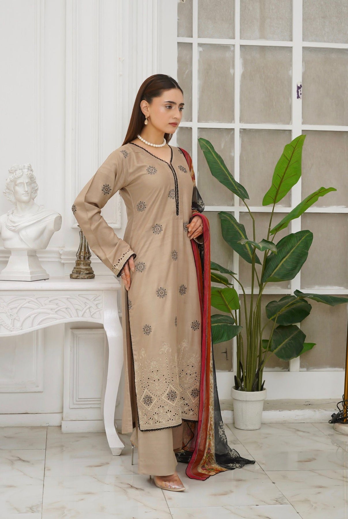 Experience refined elegance with this meticulously crafted linen suit, featuring exquisite embroidered embellishments throughout. The premium linen fabric delivers superior breathability and a refined drape, ideal for warm climates and formal occasions alike. Each piece is thoughtfully constructed as a ready-to-wear ensemble, eliminating the need for additional styling considerations. The included chiffon dupatta provides layering versatility and completes the sophisticated look. This collection piece exemplifies quality craftsmanship, combining traditional embroidery techniques with contemporary tailoring for a timeless wardrobe staple.