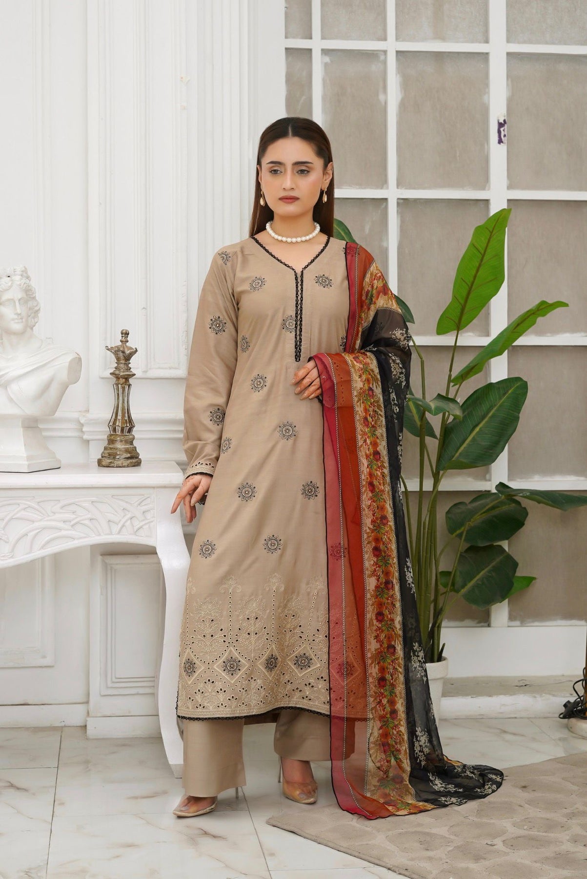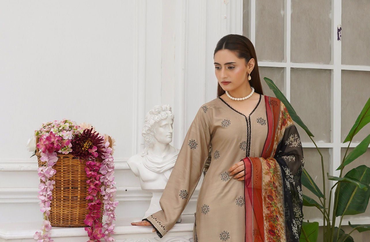 BEIGE EMBROIDERED | LINEN READY TO WEAR | SUIT WITH EMBROIDERED CHIFFON DUPATTA