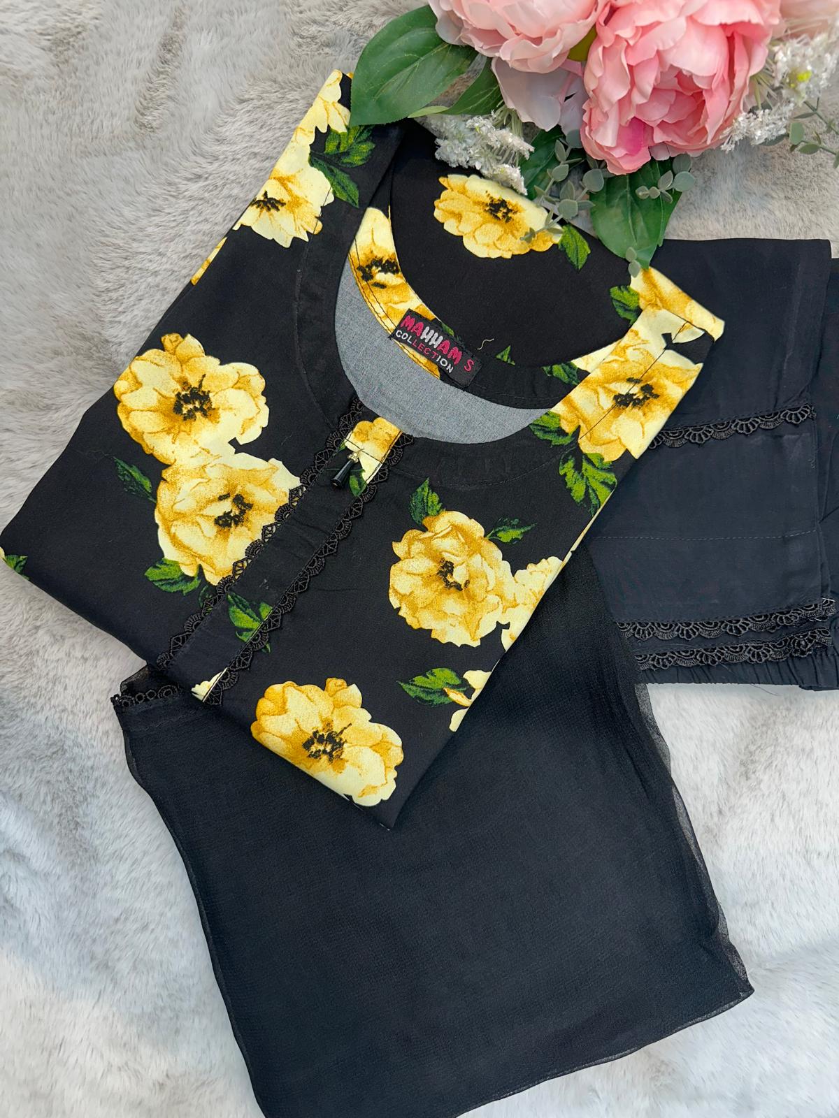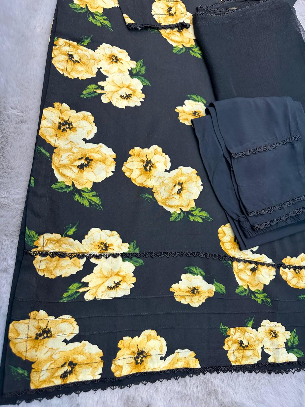 BLACK & YELLOW FLORAL PRINTED | STONE LINEN READY TO WEAR | SUIT WITH CHIFFON DUPTTA