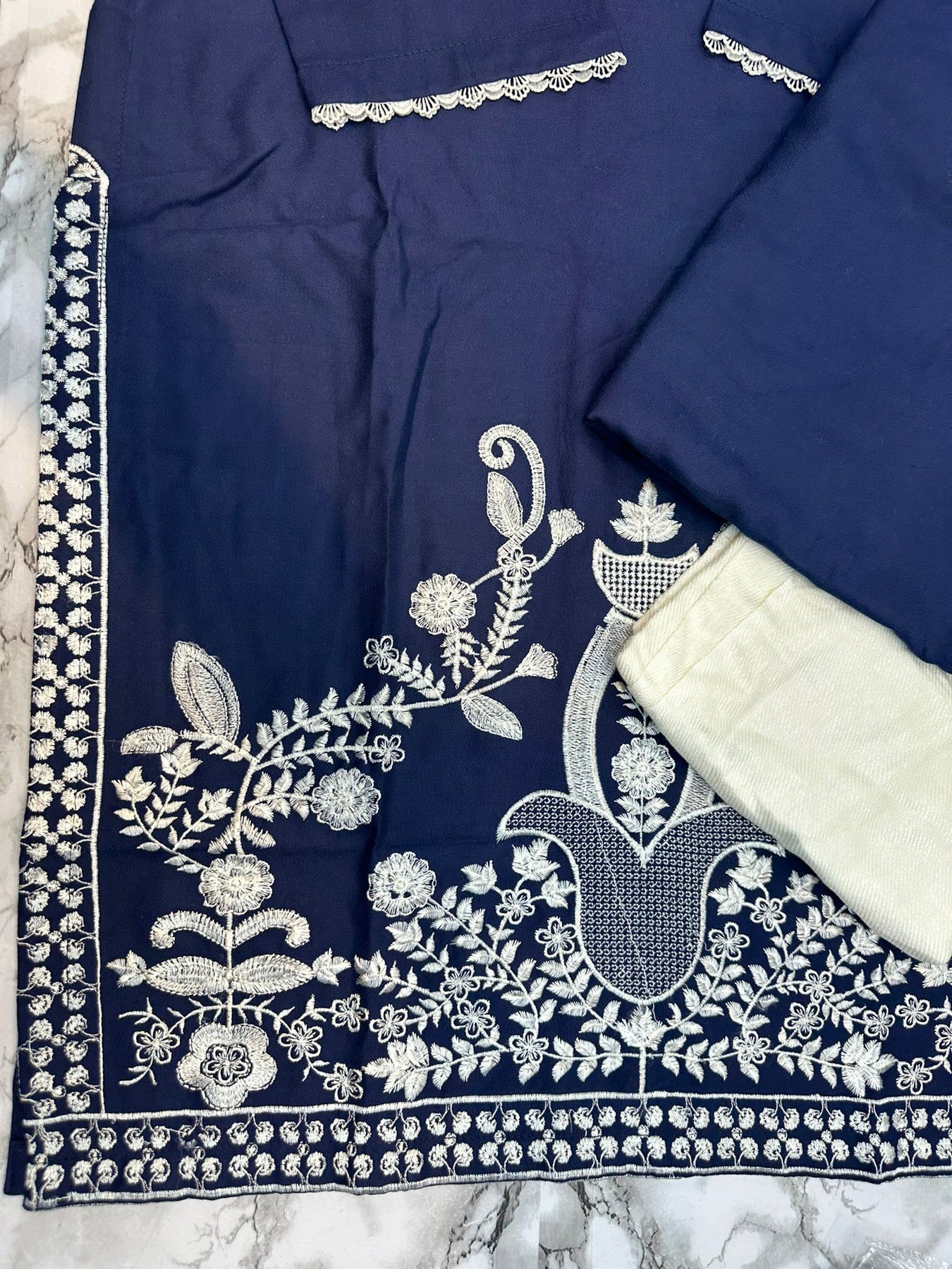 Crafted from premium dhanak fabric, this three-piece ensemble delivers sophisticated elegance with intricate embroidery detailing throughout. The coordinated suit comprises a beautifully embellished kurta, matching trousers, and a complementary stoler, offering a complete ready-to-wear solution. The rich palette exudes timeless refinement, whilst the expert embroidery work showcases traditional craftsmanship. Ideal for formal occasions and celebrations, this collection piece combines comfort with refined style, requiring minimal additional styling.