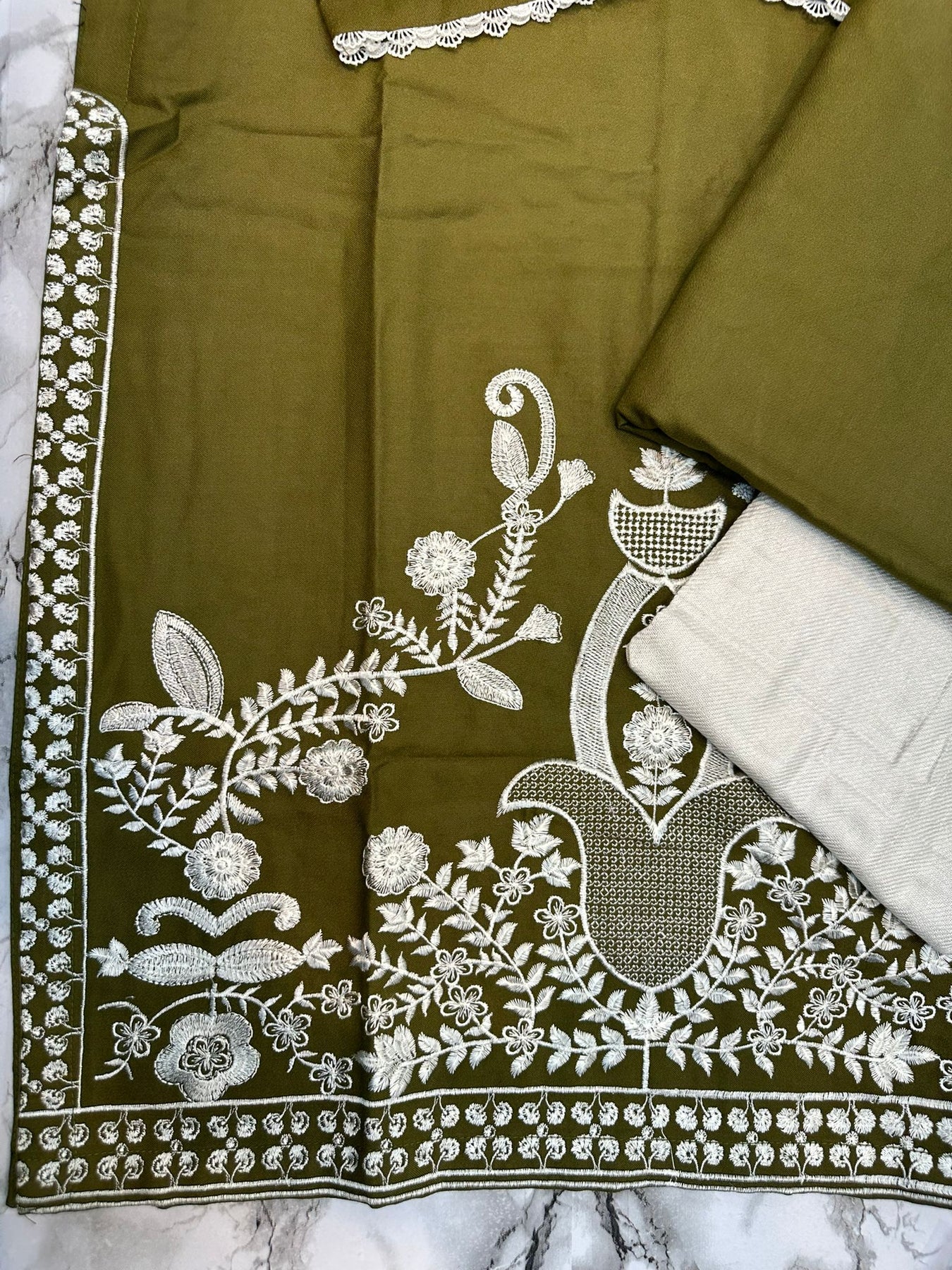 Crafted from premium dhanak fabric, this three-piece ensemble delivers sophisticated elegance with intricate embroidery detailing throughout. The coordinated suit comprises a beautifully embellished kurta, matching trousers, and a complementary stoler, offering a complete ready-to-wear solution. The rich palette exudes timeless refinement, whilst the expert embroidery work showcases traditional craftsmanship. Ideal for formal occasions and celebrations, this collection piece combines comfort with refined style, requiring minimal additional styling.
