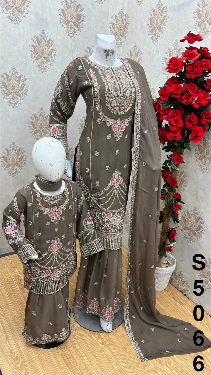 Light Brown - Embroidered Gharara Chiffon Mother & Daughter Ready to Wear Collection - Perfect for Family