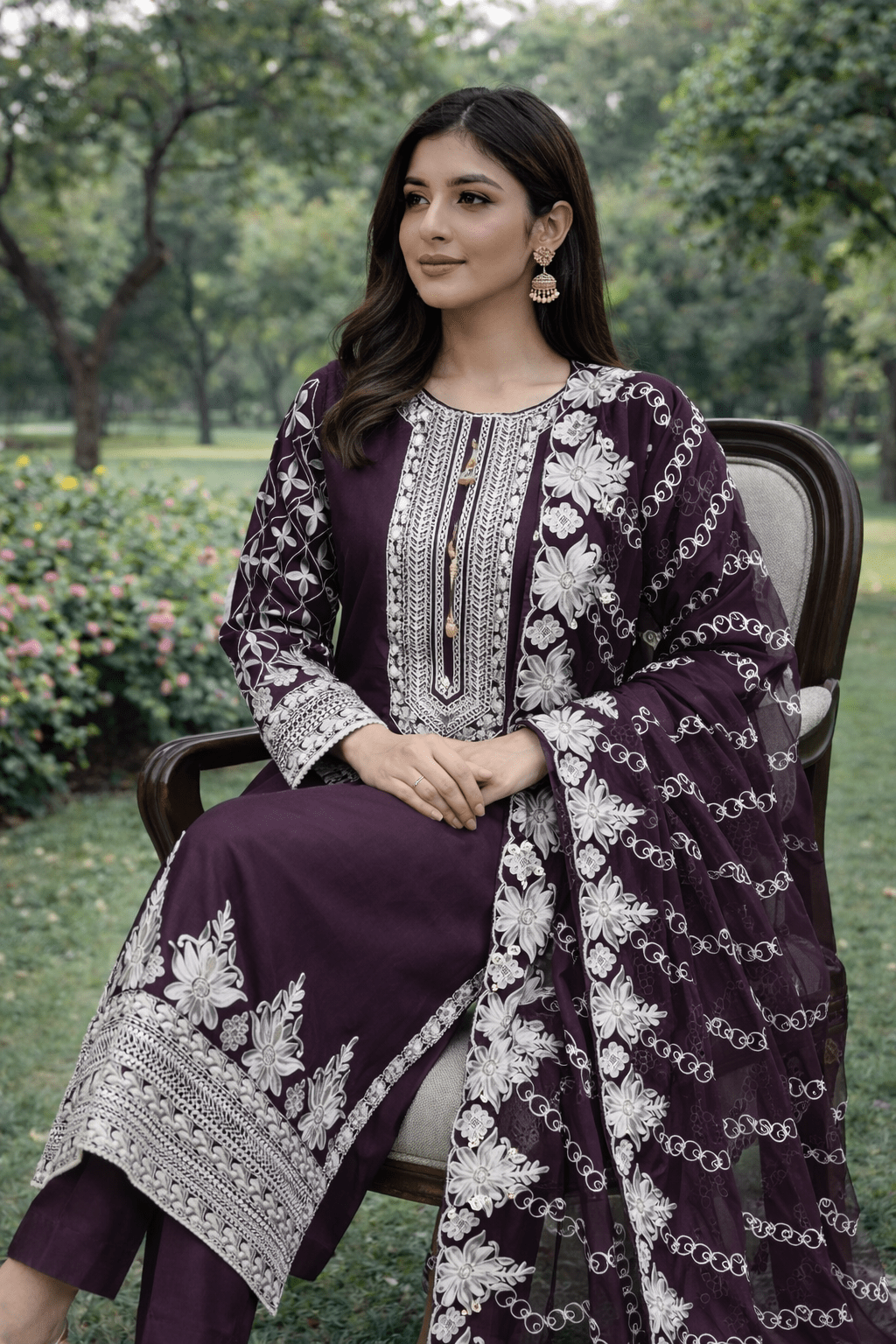 PLUM EMBROIDERED | VISCOSE READY TO WEAR | SUIT WITH EMBROIDERED CHIFFON DUPATTA