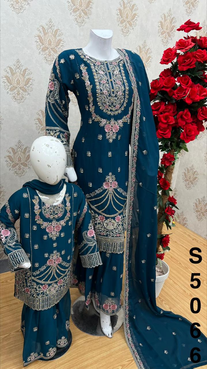 Teal Blue - Embroidered Gharara Chiffon Mother & Daughter Ready to Wear Collection - Perfect for Family
