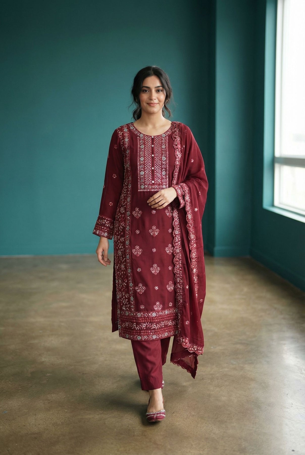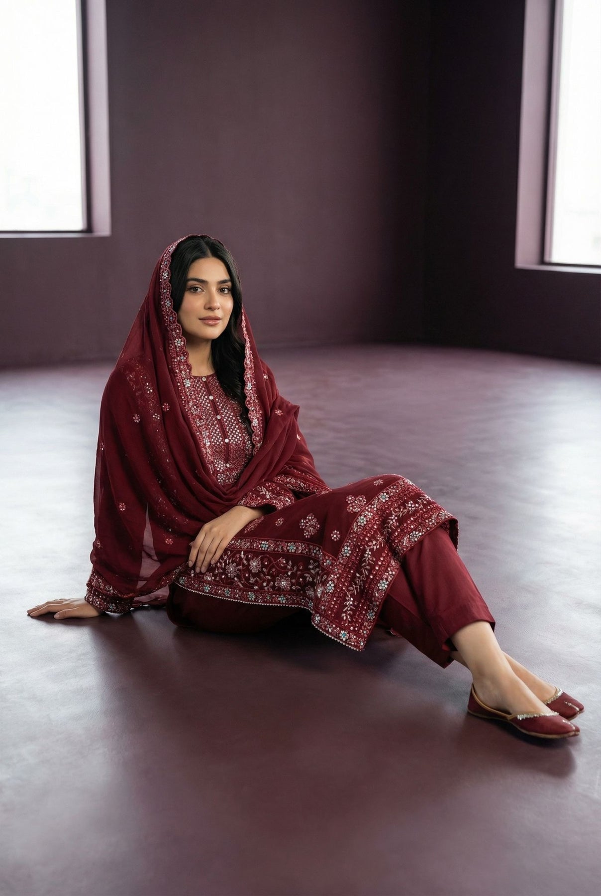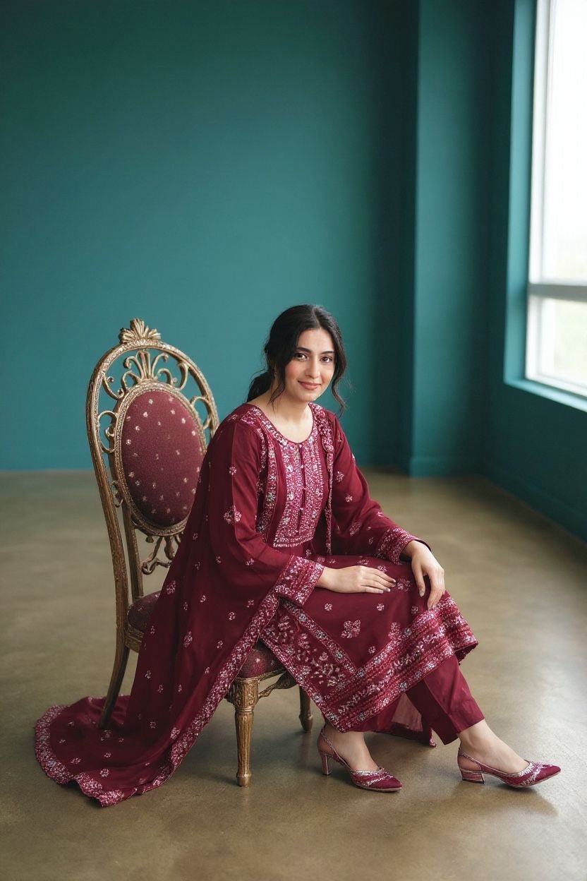 Maroon 3Pc Embroidered Chiffon Collection With Embroidered Chiffon Dupatta