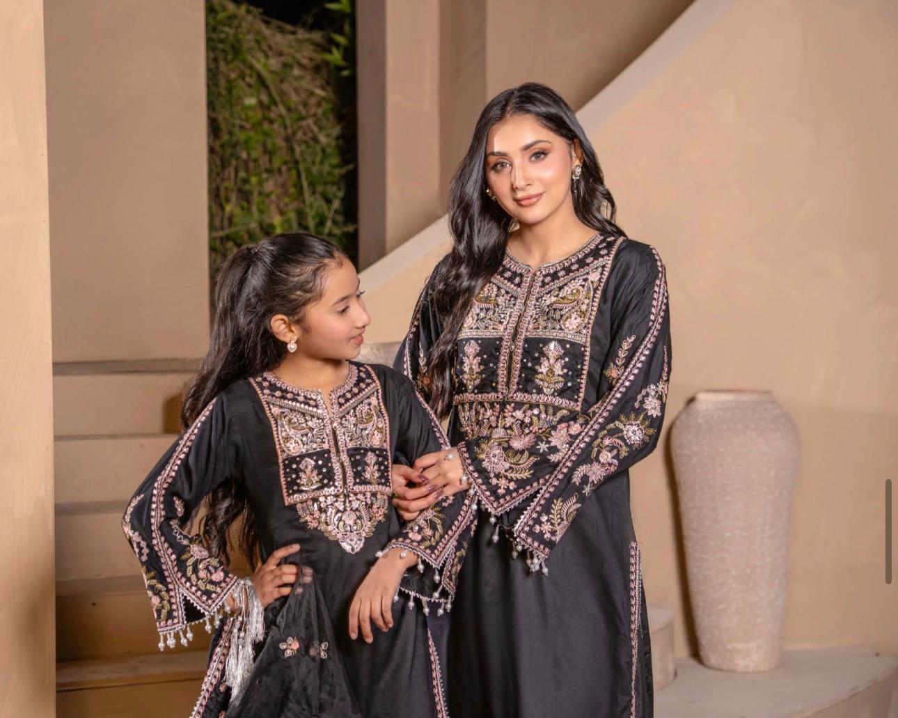 Celebrate the bond between mother and daughter with our exquisite Embroidered Plazoo Linen collection. Crafted from premium viscose fabric, each piece features intricate embroidery detailing that showcases traditional artistry. The coordinated designs allow you and your daughter to share a cohesive, elegant look for special occasions, family gatherings, or everyday wear. Viscose's natural breathability and soft drape ensure comfort throughout the day, while the refined embroidery elevates any occasion. This ready-to-wear collection combines timeless style with practical quality, making it an ideal choice for families seeking coordinated sophistication.