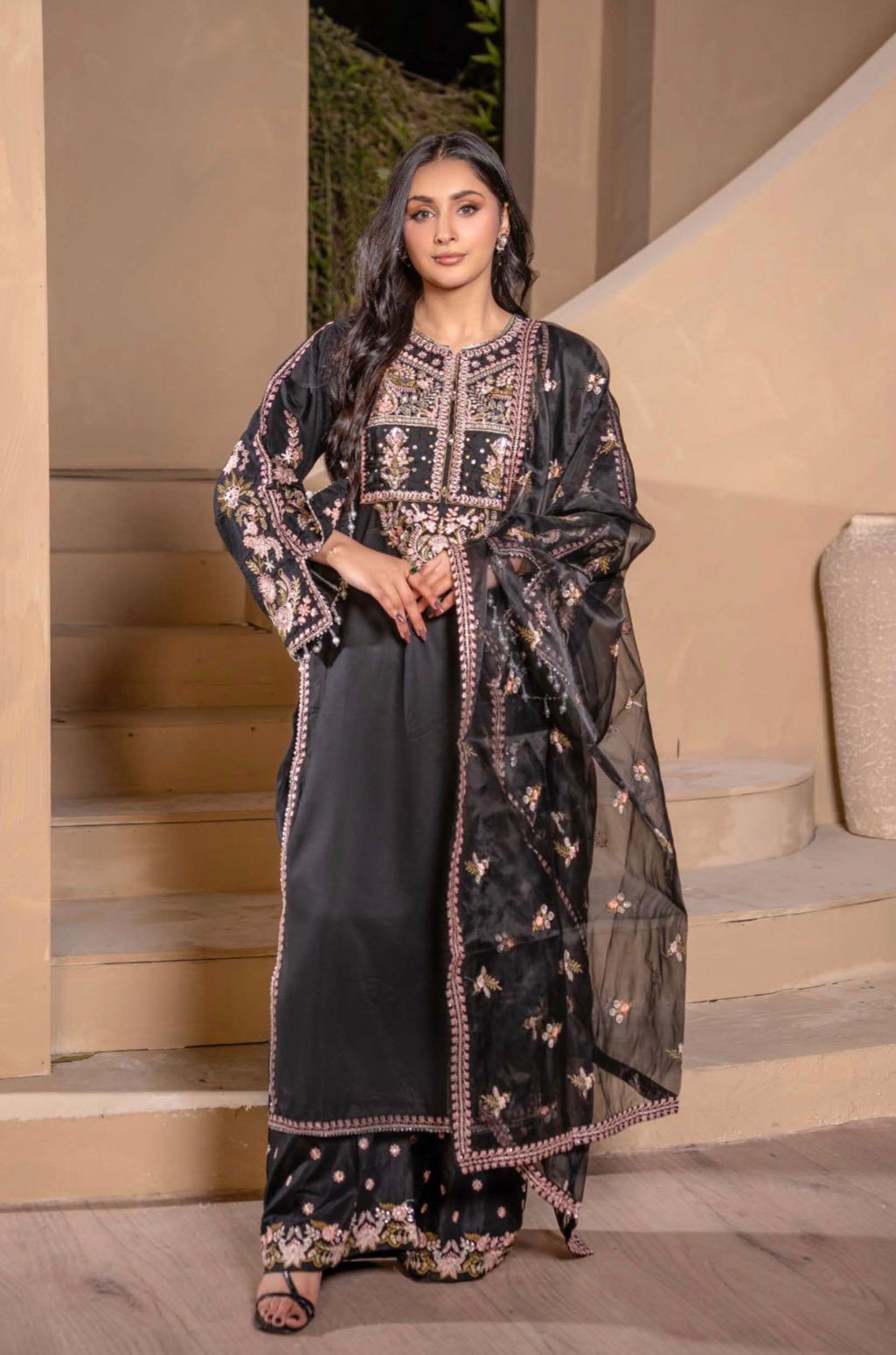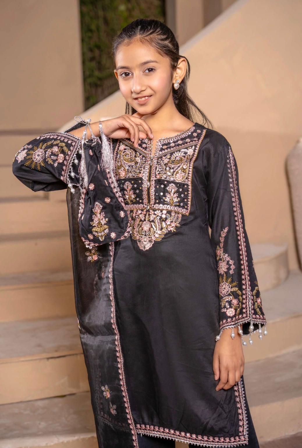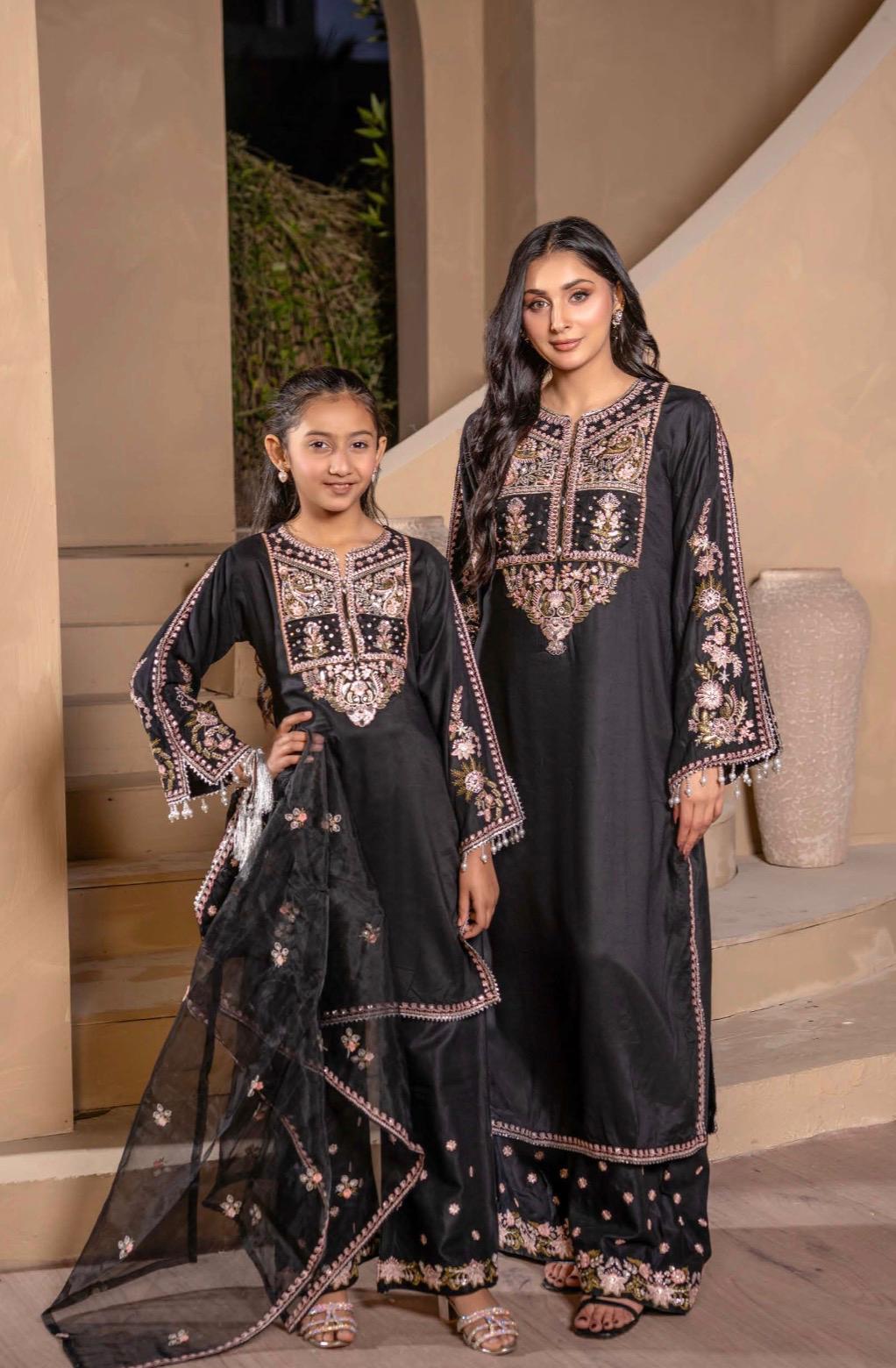 Black Embroidered Plazoo Linen Mother & Daughter Ready to Wear Collection - Perfect for Family