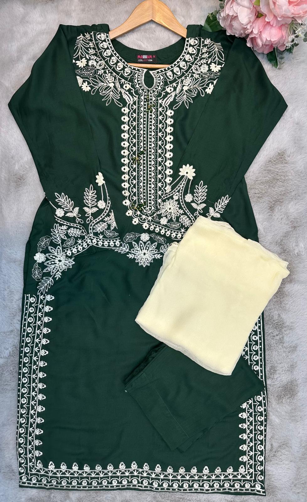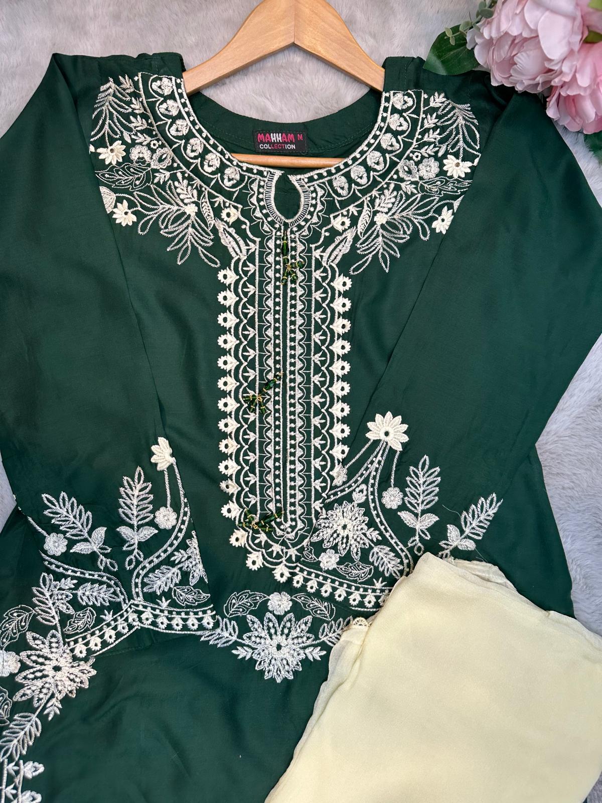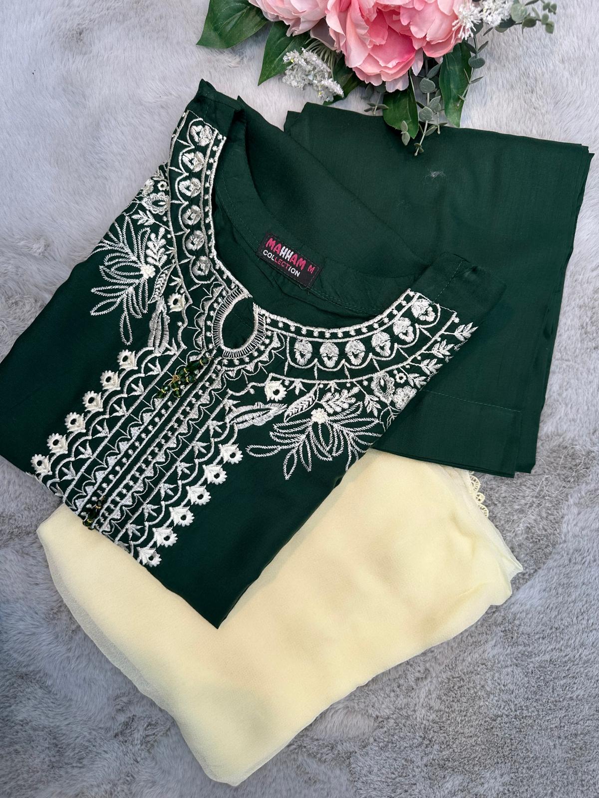 BOTTLE GREEN EMBROIDERED | LINEN READY TO WEAR | SUIT WITH CHIFFON DUPATTA