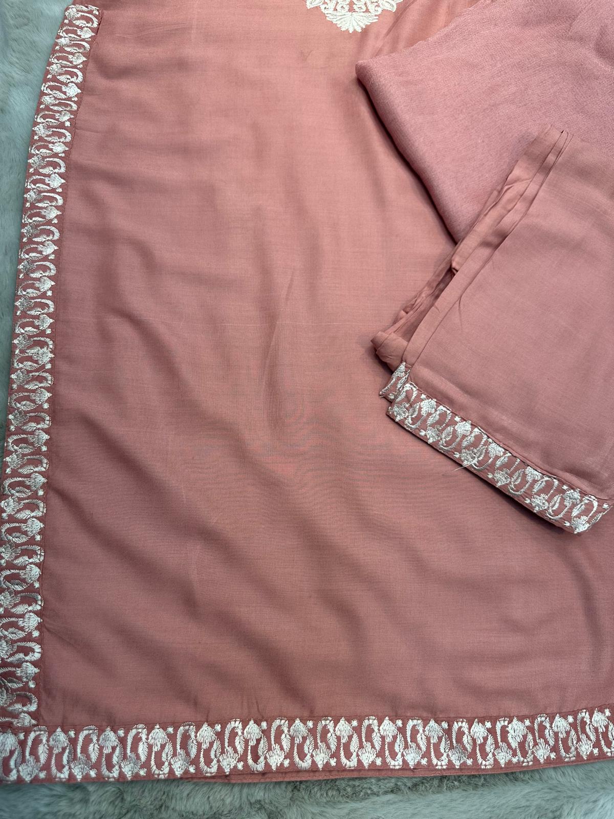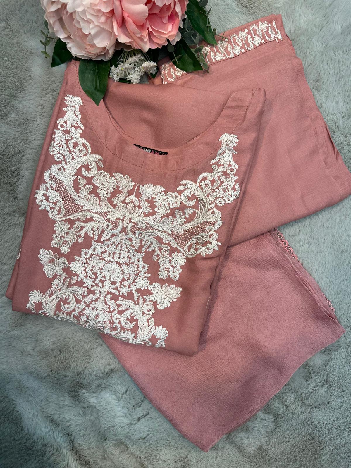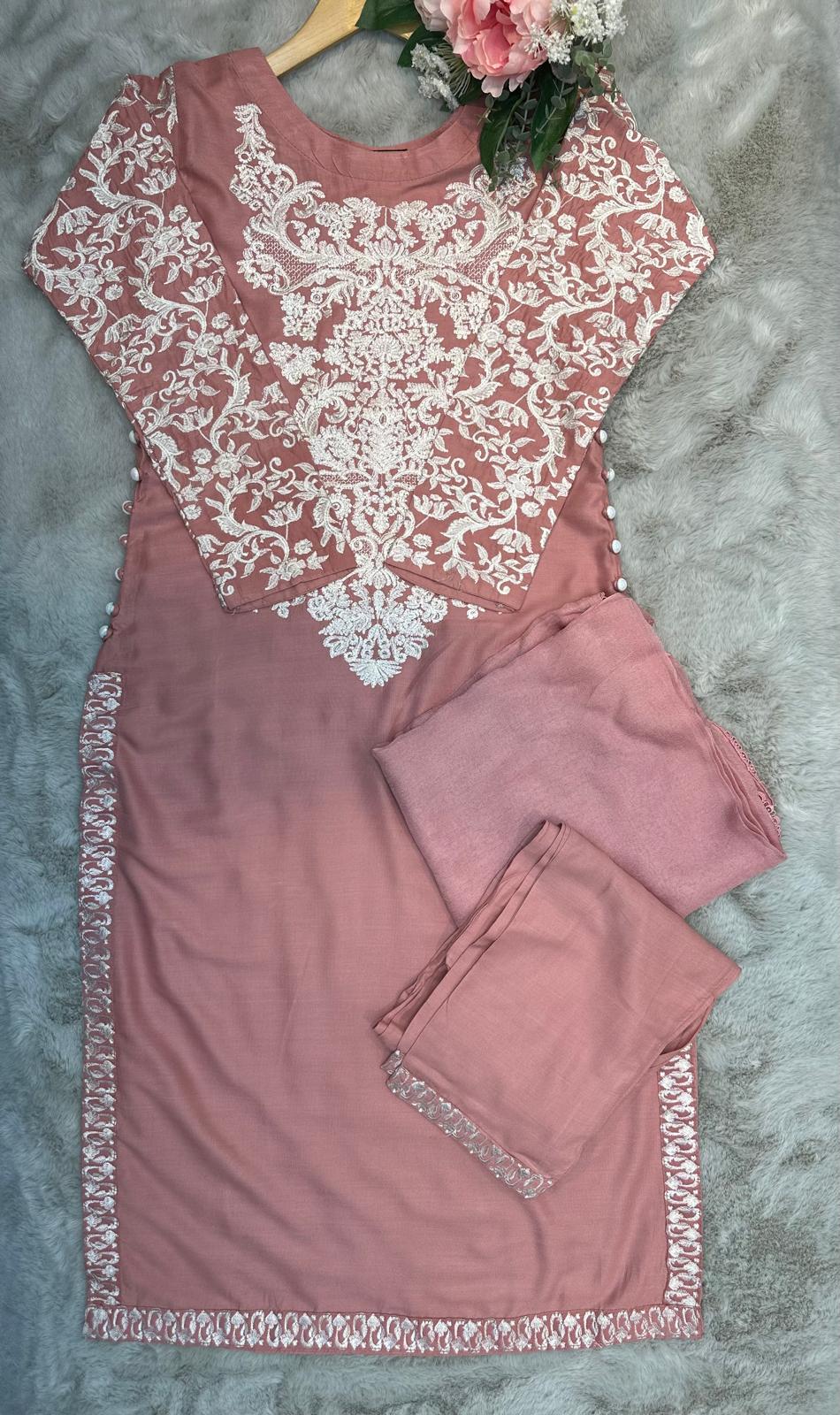 DUSTY PINK EMBROIDERED | LINEN READY TO WEAR | SUIT WITH CHIFFON DUPATTA