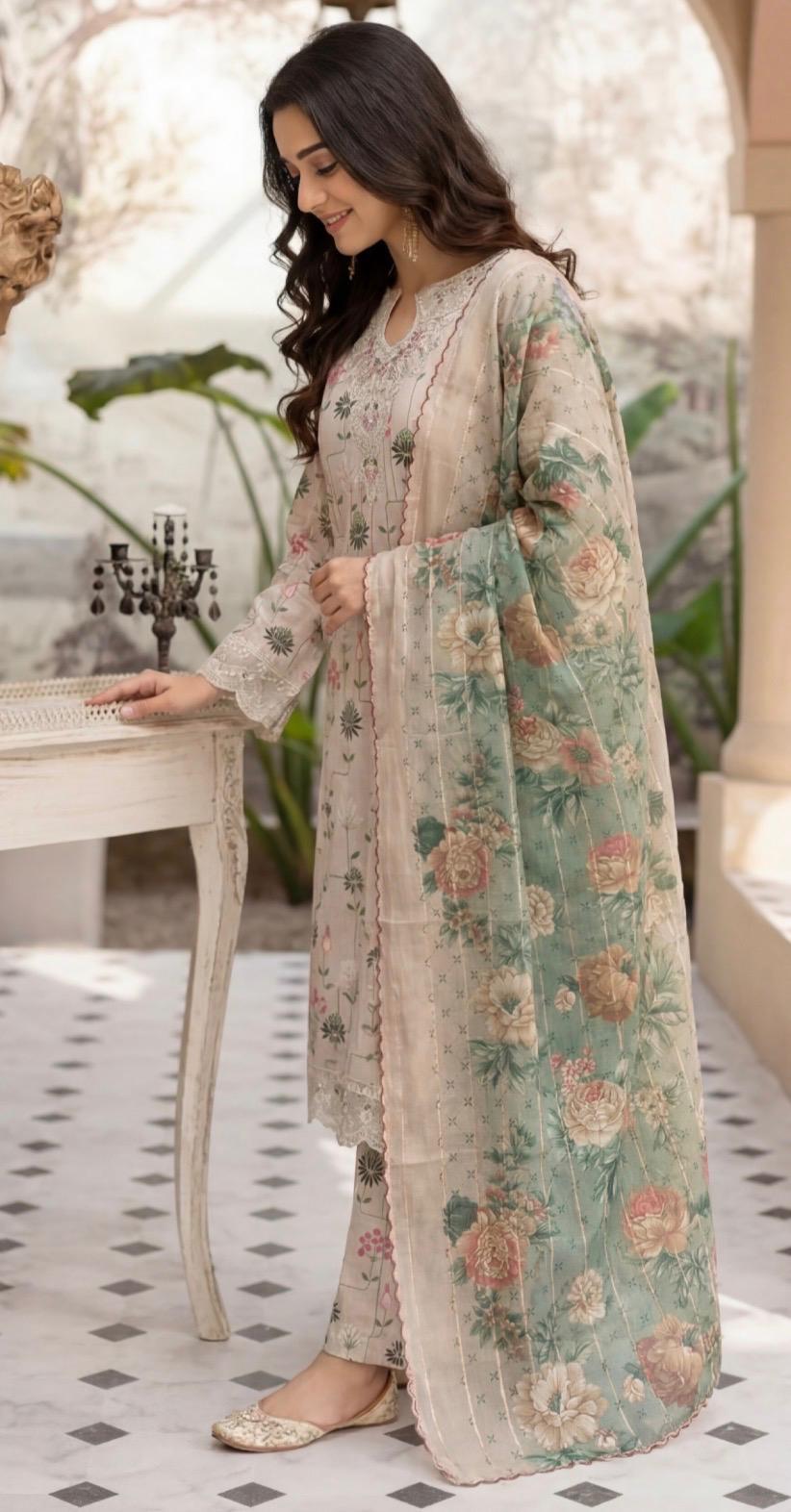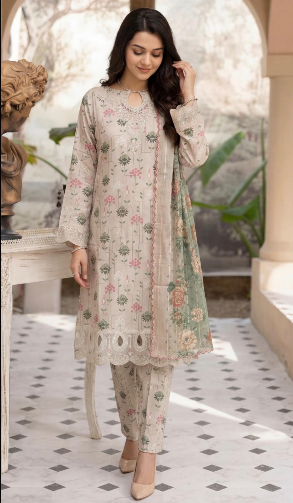 Each set features beautifully stitched fancy digital printed lawn shirts enhanced with subtle embellishments for a graceful look. It is paired with an exclusive voile printed dupatta that adds a soft, airy feel, while the stitched plain cambric trouser ensures comfort and a polished finish.