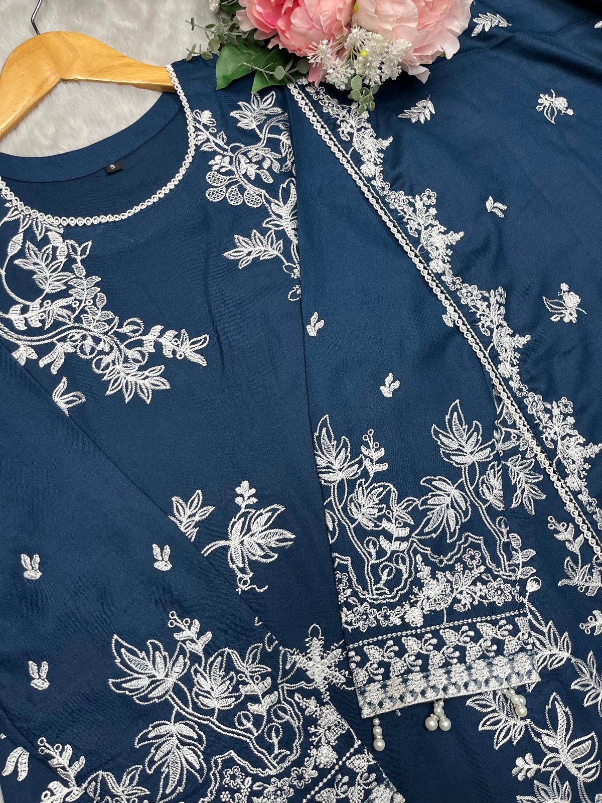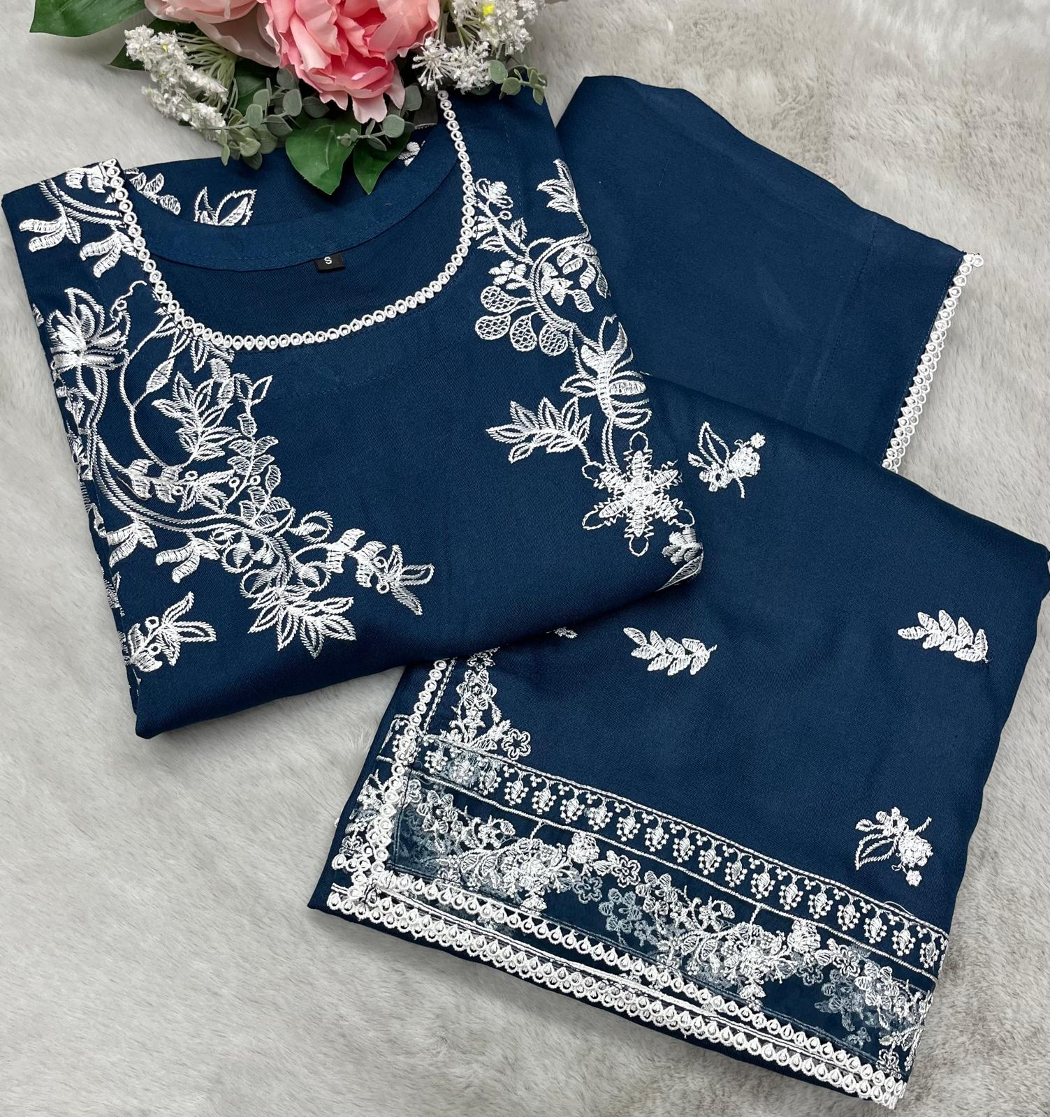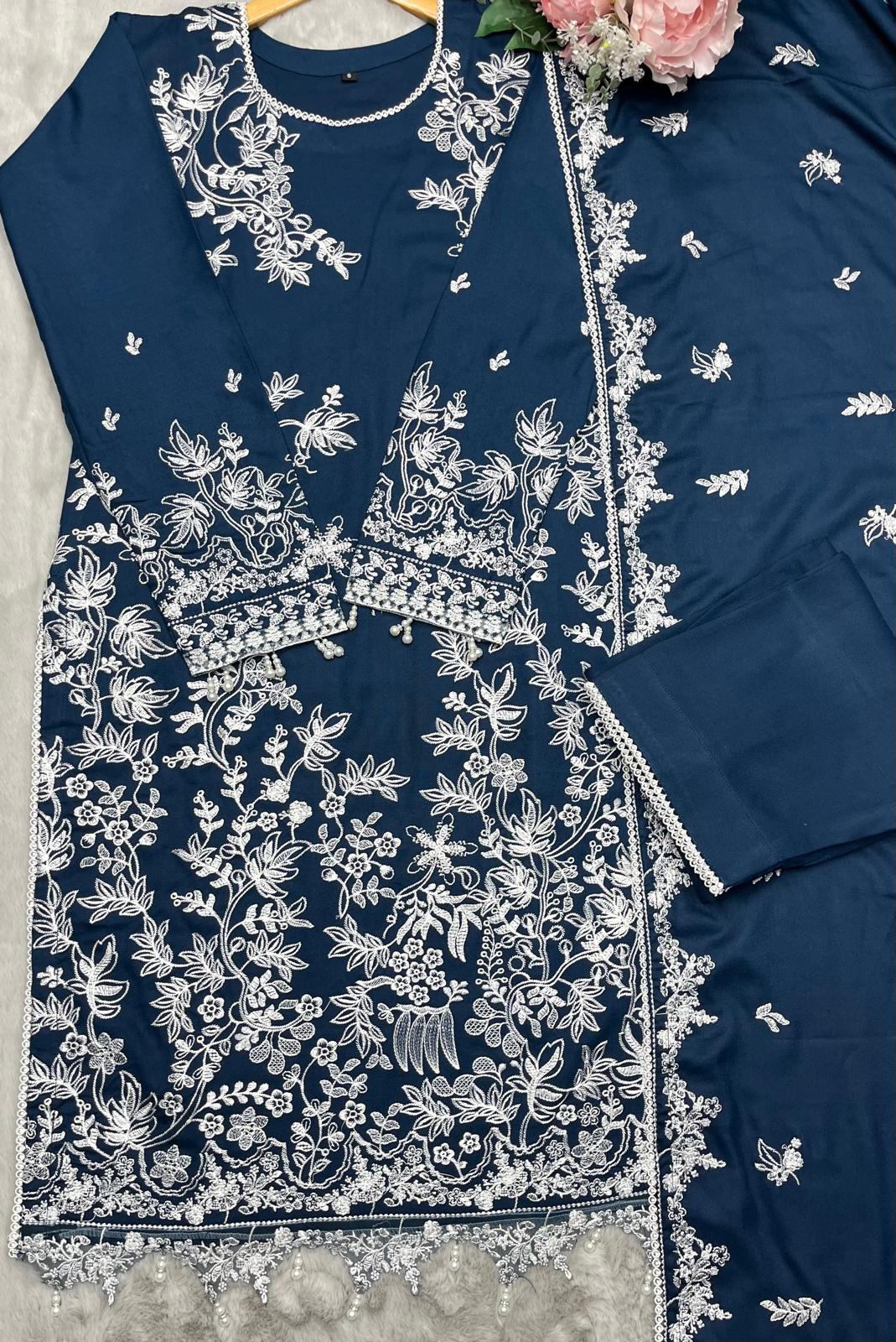 Elevate your wardrobe with this exquisite three-piece designer suit crafted from premium dhanak fabric. Featuring intricate embroidered patchwork detailing throughout, this ensemble combines traditional craftsmanship with contemporary elegance. The set includes a beautifully tailored kurta, coordinating trousers, and a luxurious shawl, offering versatile styling for both formal occasions and refined everyday wear. The dhanak material provides exceptional durability and a refined drape, whilst the meticulous embroidery showcases expert artisanal work. Perfect for those who appreciate sophisticated design and quality construction.