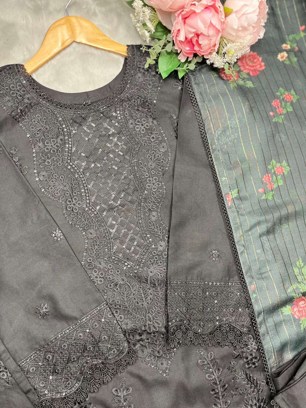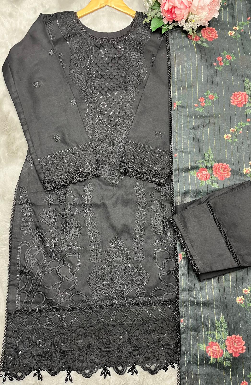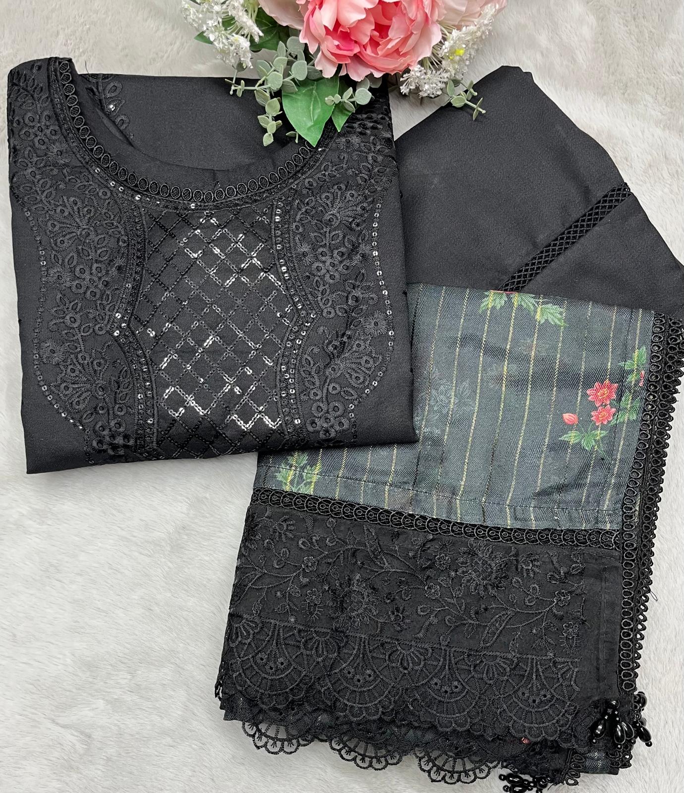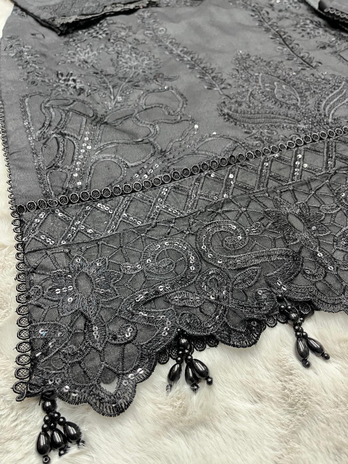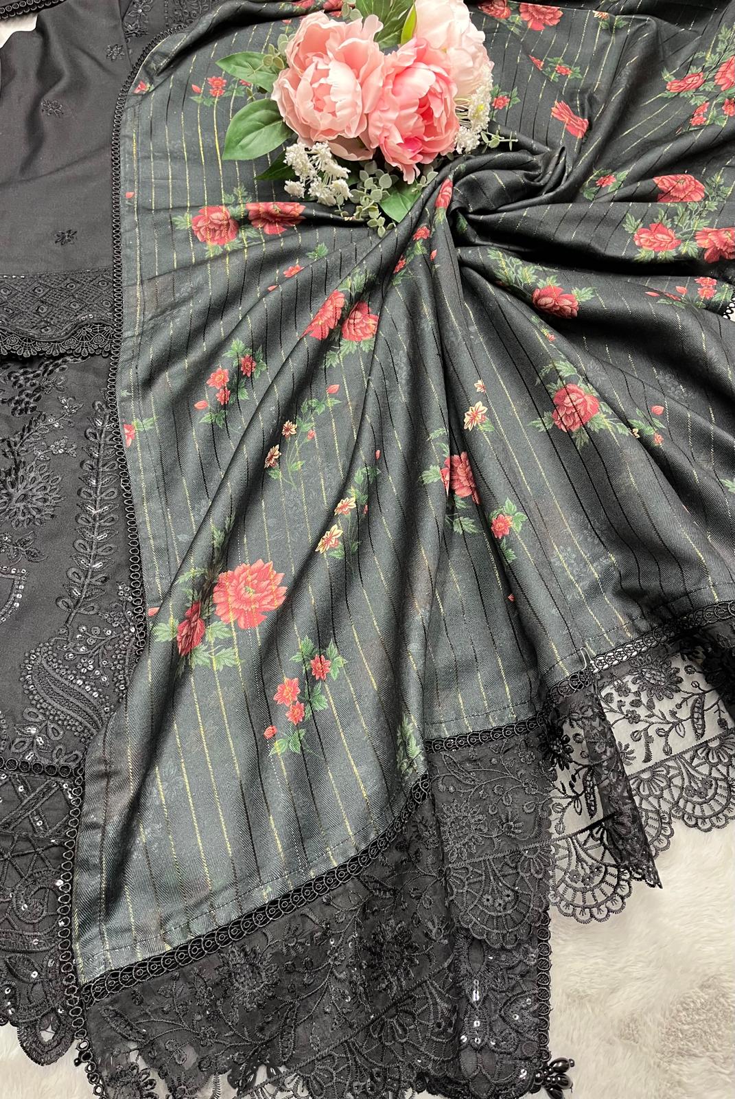 BLACK 3 PC DESIGNER | EMBROIDERED PATCH WORK DHANAK | WITH SHAWL SUIT