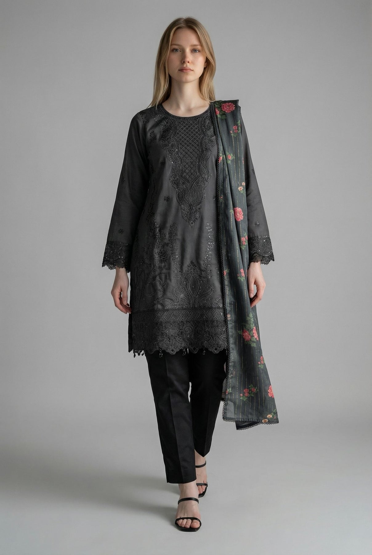 Woman wearing a black outfit with a floral scarf on a gray background