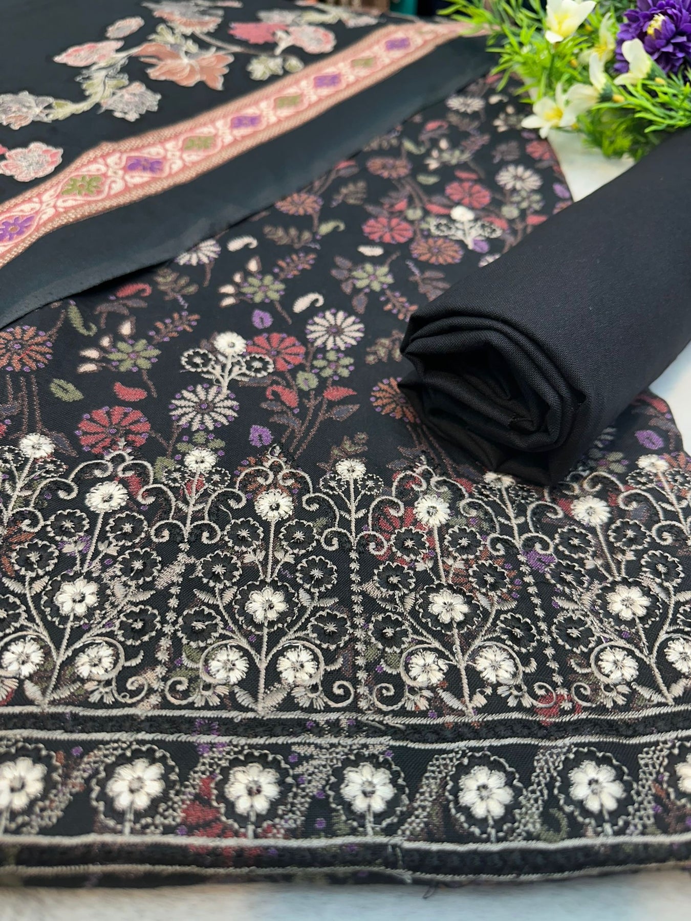 Black fabric with floral embroidery and a brand logo, displayed on a gray surface with greenery.