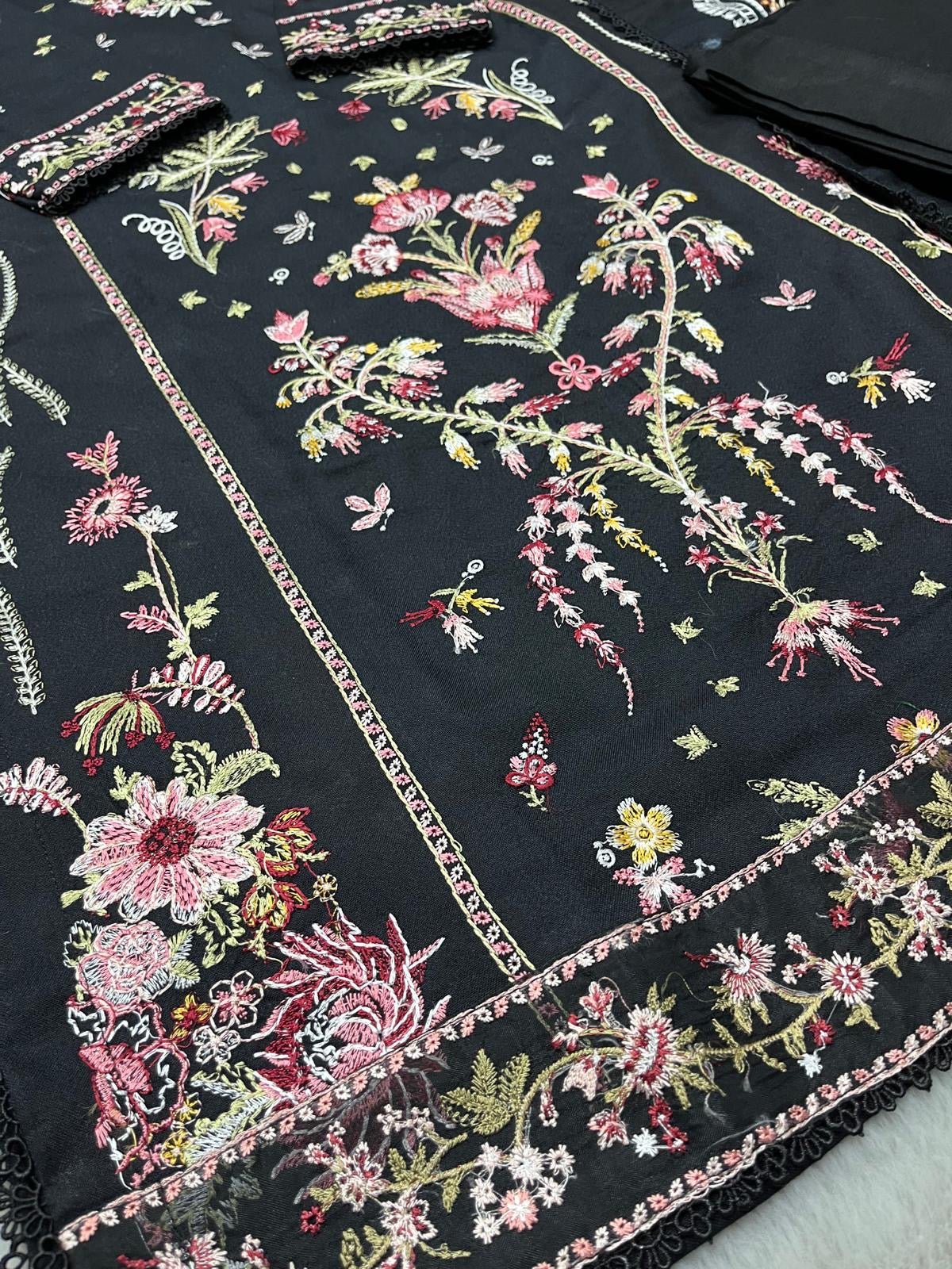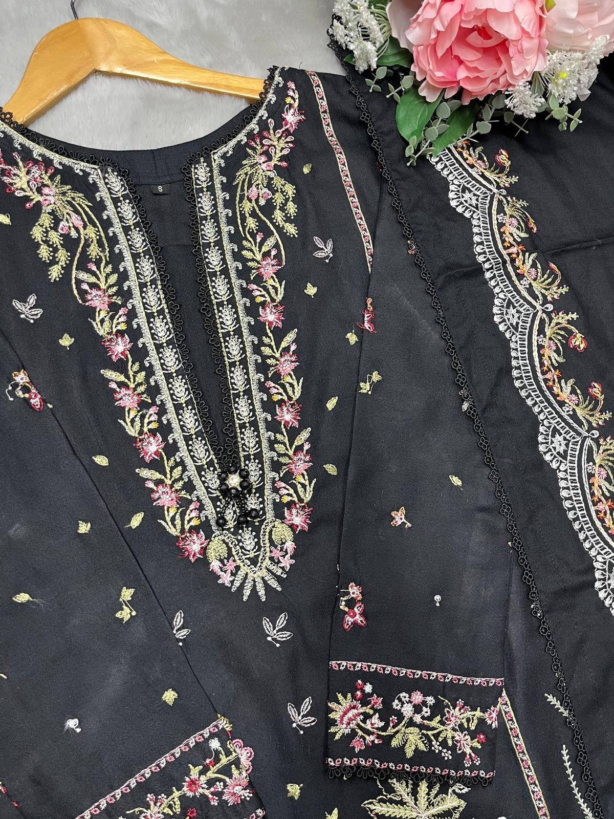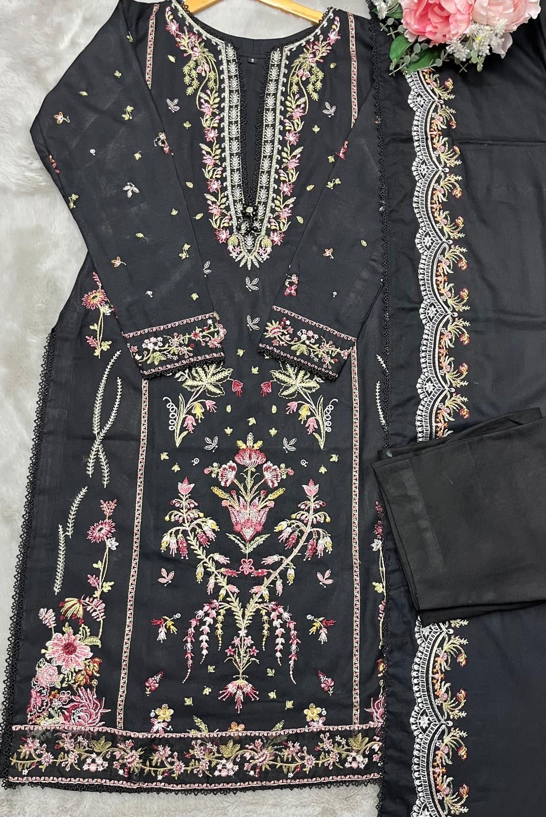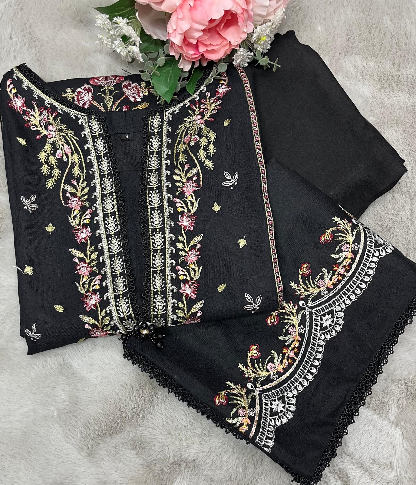 BLACK 3 PC DESIGNER | EMBROIDERED PATCH WORK DHANAK | WITH SHAWL SUIT
